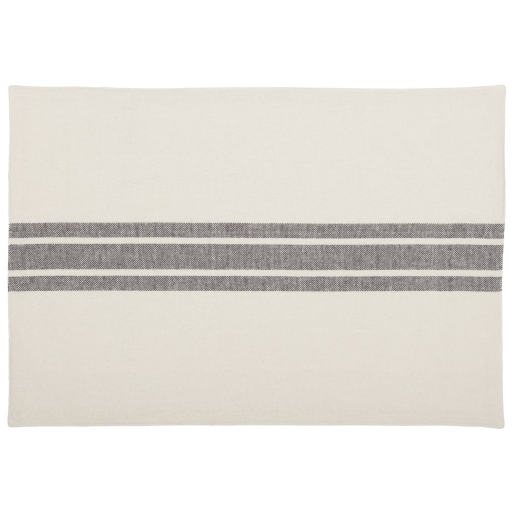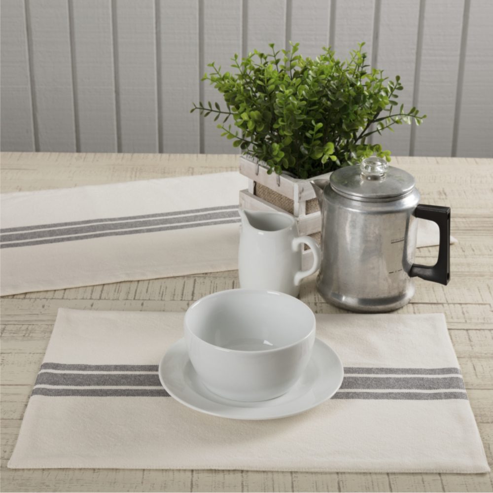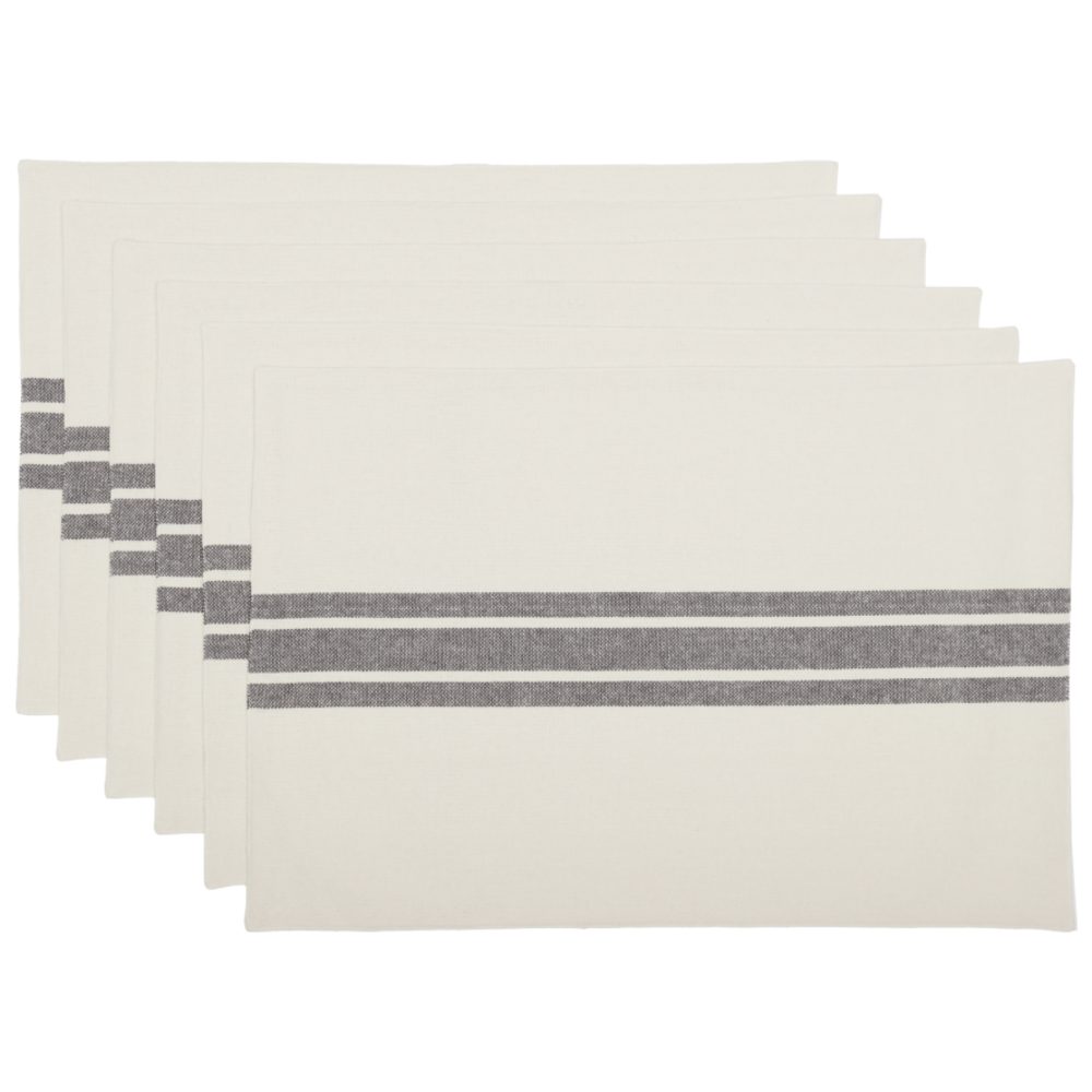 Introducing the Marketplace Gray Placemat Set. Four exquisite pieces, each measuring 18Lx12W, crafted from a cream cotton fabric. A distinctive charcoal gray grainsack stripe adds a touch of sophistication. The reverse side is a solid cream fabric, providing versatility for your table setting. Made entirely from textured cotton, these placemats offer a tangible sense of quality. Imagine them in your home, adding a touch of elegance to every meal.