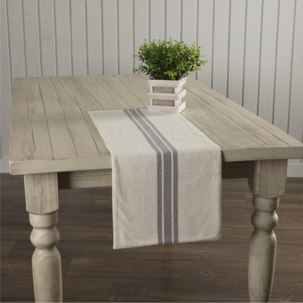 These days we can't seem to get enough of grain sack fabrics, so this collection is one of our all-time favorites! It's the perfect look for a fresh farmhouse-style home! We chose a beautifully textured cotton fabric with a substantial weight, yet soft touch for the Market Place fabrics. The woven grain sack stripes in charcoal grey make a striking contrast to the natural cream base. Three coordinating fabric options in the Market Place Collection offer an easy mix-and-match solution. The runner reverses to a soft cream cotton fabric and measures 36L x 13W.
