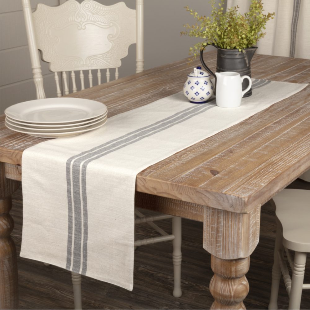 These days we can't seem to get enough of grain sack fabrics, so this collection is one of our all-time favorites! It's the perfect look for a fresh farmhouse style home! We chose a beautifully textured cotton fabric with substantial weight, yet soft touch for the Market Place fabrics. The woven grain sack stripes in charcoal grey make a striking contrast to the natural cream base. Three coordinating fabric options in the Market Place Collection offer an easy mix-and-match solution. The runner reverses to a soft cream cotton fabric and measures 54L x 13W.