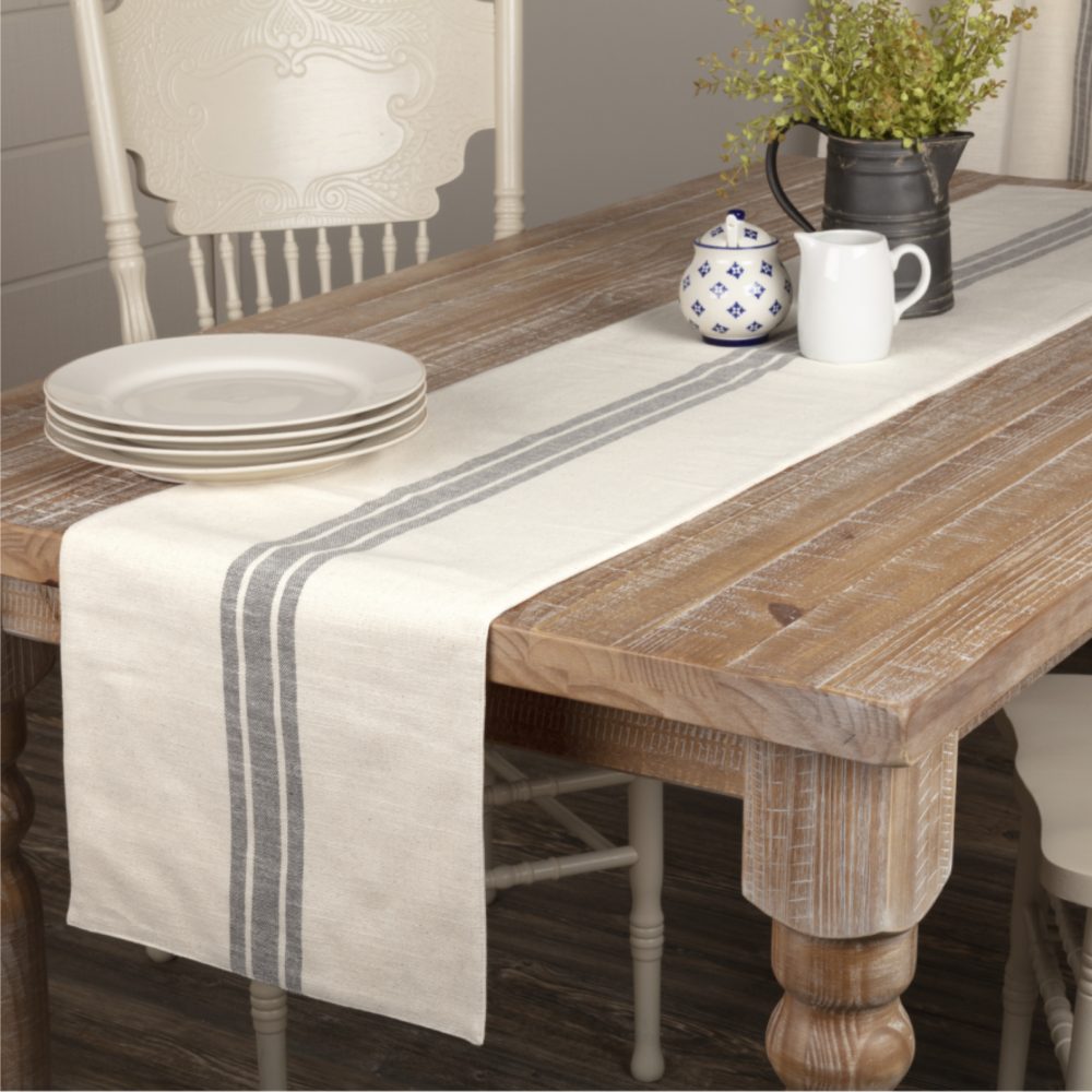 These days we can't seem to get enough of grain sack fabrics, so this collection is one of our all-time favorites! It's the perfect look for a fresh farmhouse style home! We chose a beautifully textured cotton fabric with substantial weight, yet soft touch for the Market Place fabrics. The woven grain sack stripes in charcoal grey make a striking contrast to the natural cream base. Three coordinating fabric options in the Market Place Collection offer an easy mix-and-match solution. The runner reverses to a soft cream cotton fabric and measures 72L x 13W.