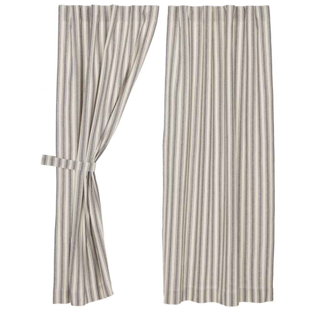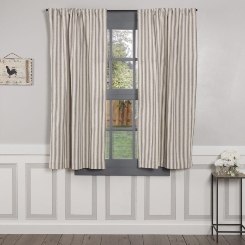Introducing a cozy addition to your home - our Market Place Gray Ticking Stripe Short Panel Set. Reminiscent of a warm farmhouse or quaint cottage, this set of two panels, each measuring 63Lx36W, is crafted from 100% cotton. They're machine washable and can be line dried and ironed, making life a little easier. The panels come in a soothing shade of cream and a deep, charcoal grey. Do you remember the first time you saw a farmhouse or a cottage, and how it felt like coming home? Our panels also feature hanging loops on the back, offering an alternative display look. It comes with tie-backs and a white cotton lining, perfect for those sunny afternoons where you just want to let in a little more light. Plus, with a 3.25-inch rod pocket, they'll easily fit most standard curtain rods. Can't you just picture how they'd look in your home, bringing a touch of countryside charm? We can!
