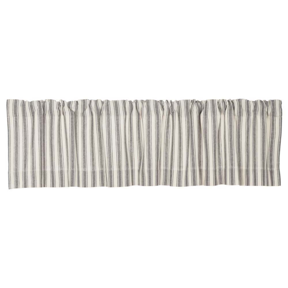 These days we can't seem to get enough of ticking and grain sack fabrics, so this collection is one of our all-time favorites! It's the perfect look for a fresh farmhouse style home! We chose a beautifully textured cotton fabric with a substantial weight, yet soft touch for the Market Place fabrics. The woven ticking stripes in charcoal grey make a striking contrast to the natural cream base. Three coordinating fabric options in the Market Place Collection offer an easy mix-and-match solution. The valance is lined with white cotton, features a 3.25 rod pocket with fabric loops for an alternate hanging option, and measures 16L x 72W.
