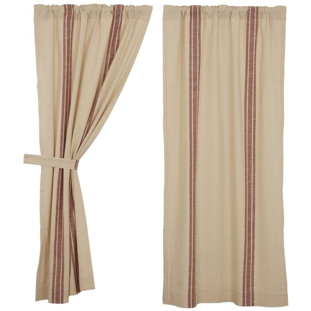 We LOVE ticking and grain sack fabrics and we know that you do too! When we combined grain sack fabric with wide stripes in our Market Place Collection, we created one of our most popular and timeless farmhouse styles. We've been hearing for some time now that many of you would like to see the Market Place in a true farmhouse red. Well, here it is, and it's a dream come true! For this collection we chose a beautifully textured, substantial weight cotton with a surprisingly soft hand feel. The panels have two sets of broad woven grain sack stripes in muted brick red that run vertically down the length of the curtain, creating a delightful contrast against the natural cream base and visually adding height to your room. Panels are lined with white cotton, feature no header, a 3.25 rod pocket as well as fabric loops for an alternate hanging option. Panel curtains measure 63L x 36W and are sold as a set of 2, with a total width of 72.