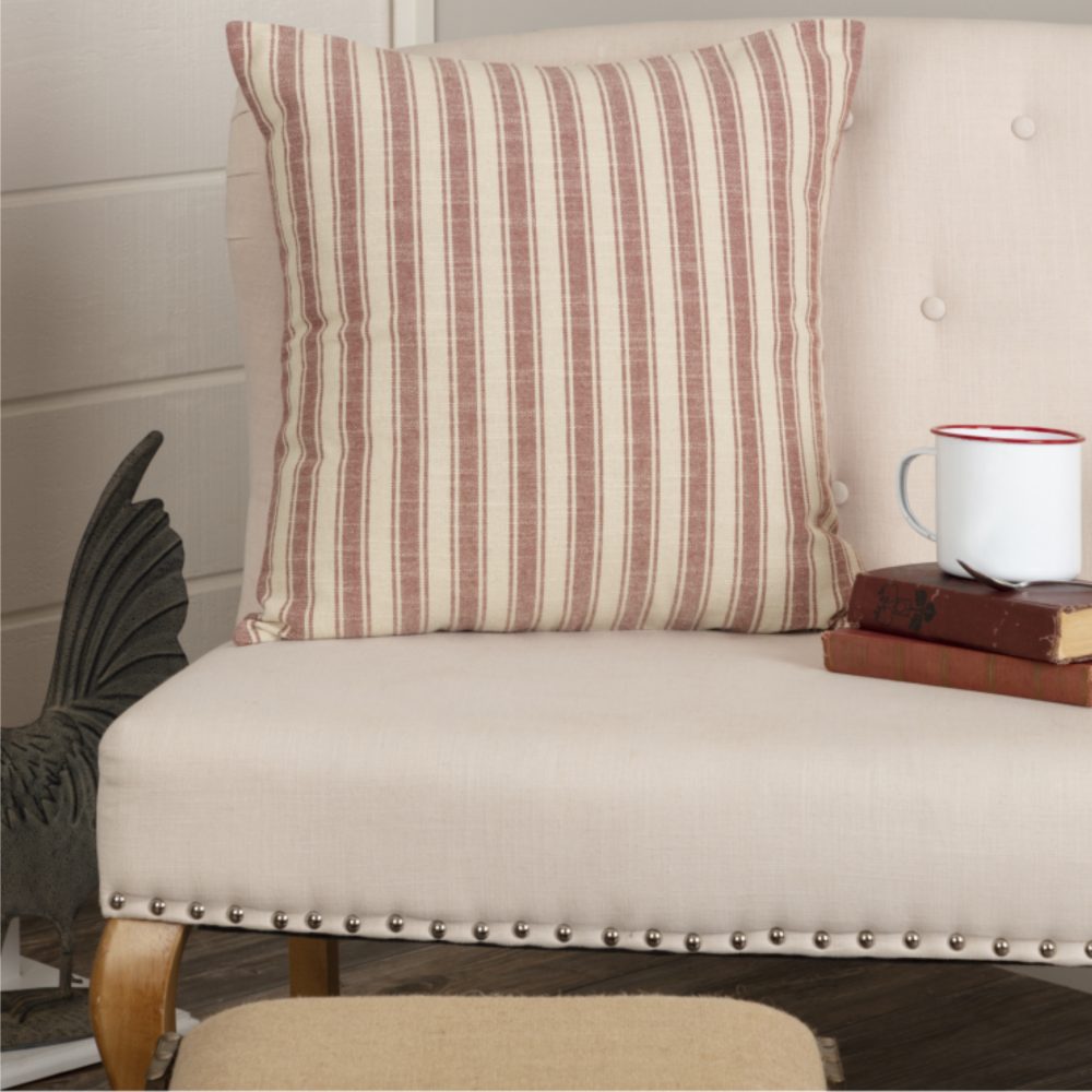 We LOVE stripes and grain sack fabrics and we know that you do too! When we combined grain sack fabric with wide ticking stripes in our Market Place Collection, we created one of our most popular and timeless farmhouse styles. We've been hearing for some time now that many of you would like to see the Market Place in a true farmhouse red. Well, here it is, and we just know you're going to love it! We chose a beautifully textured, substantial weight cotton fabric with a surprisingly soft hand feel for this collection. The repeating woven ticking stripes in muted brick red make a delightful contrast against the natural cream base adding the perfect touch of farmhouse to every setting. The 20 x 20 pillow has the same ticking fabric on the front and back and features 2 natural wooden buttons (w/one button inside, just in case) that hold the insert in place. (Pillow insert sold separately.)