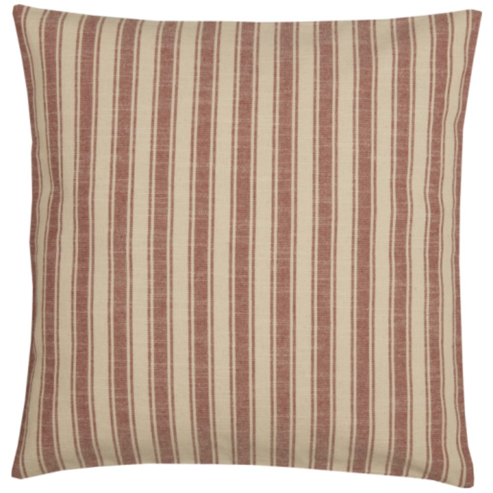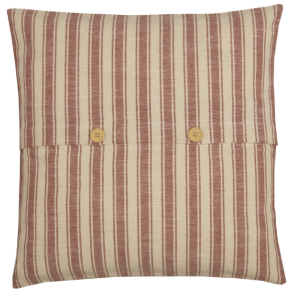 - Textured solid cream woven cotton fabric; Wide woven brick red ticking stripes on both front and back; Turned edge seam; Reverses to same as front; Features 2 wooden button closures plus 1 spare hidden button with 3 overlap to conceal pillow insert; Machine stitched; Single fabric