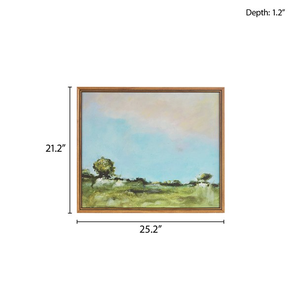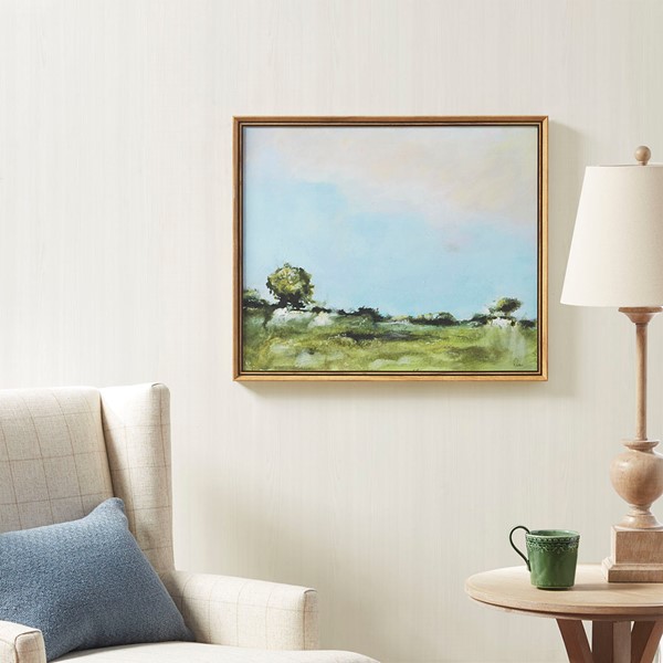 Bring the great outdoors to your home with the Martha Stewart Across The Plains 2 Abstract Landscape Framed Canvas Wall Art by Artist Delsie Walters. This framed canvas features a lush country landscape with a gel coating that provides additional texture and glossy finish, while also preserving the vivid colors over time. A gold frame complements the farmhouse style artwork by adding a little sheen, while two D-rings on the reverse makes it easy to hang. Part of the Martha Stewart Farmhouse Collection, this framed gel coated canvas adds a tranquil update to your living room or home office decor. Comes as a single piece measuring 25.2×21.2" and spot clean only.