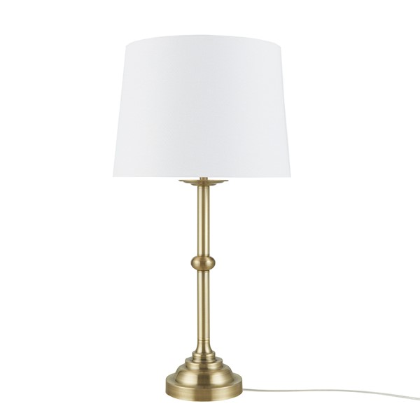 Add a touch of elegance to your living space with this beautiful Aelorian table lamp from the Bedford collection by Hampton Hill. This classic lamp features an antique brass finish and an empire fabric shade in off-white color. The on/off rotary switch is on socket and the lamp plugs in, so it’s easy to operate. The 60″ clear colored cord is polarized for safety. Comes with one Type A, 9W LED light bulb and 2-year limited warranty. Simple assembly is required.