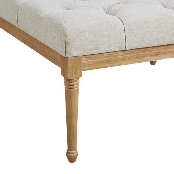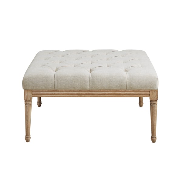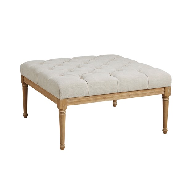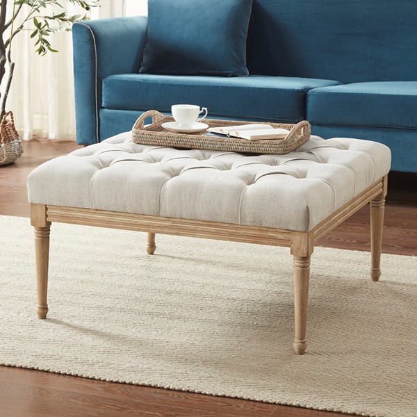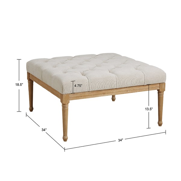 Martha Stewart’s Bedford home drives the inspiration behind the design of the Bonnieville Accent Ottoman. This square ottoman is upholstered in a beautiful woven fabric with tufted buttons and an exposed wood frame to create an elegant transitional look. The cushioned top is flat enough to place trays, books, or drinks, allowing this accent ottoman to be used as traditional furniture or as a coffee table or for extra seating. Turned solid wood legs in a reclaimed finish complement the upholstery with a charming rustic touch. With its versatile and classic design, this upholstered square ottoman will be a timeless addition to your living room or bedroom. Spot clean spills immediately with a soft, clean cloth and mild soap and water only. For set stains, work with a professional upholstery cleaning service. Simple assembly is required.