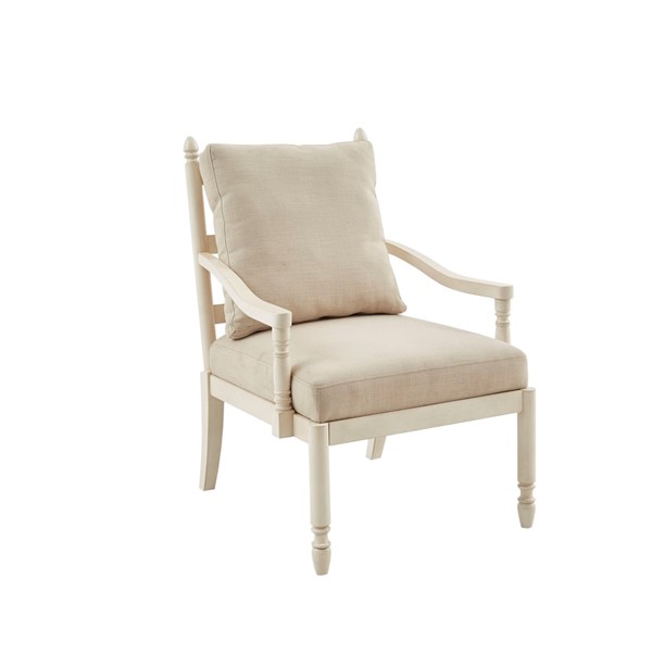 The Martha Stewart Braxton Accent Chair offers a simple and quaint farmhouse update to your living room decor. The removable back cushion and seat are upholstered in a cream fabric and provide soft and cozy comfort. An antique cream wood finish adorns the solid wood frame, completing the look of this country accent chair. Assembly is required and a tool is included.
