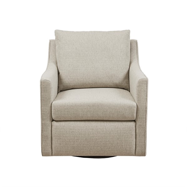 * Fully upholstered swivel armchair features a classic structured look with piping along the sloped arms