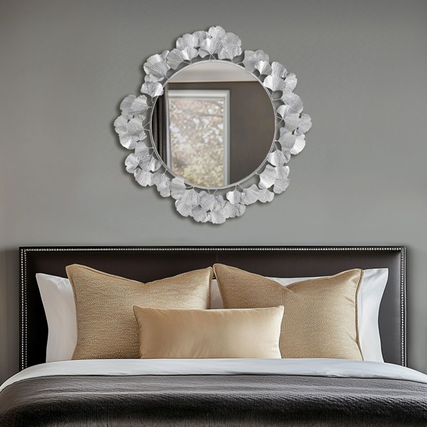 Add a touch of timeless elegance to your space with the Gingko Round Wall Mirror from the Martha Stewart Perry Street Collection. Featuring a beautifully sculptural frame adorned with intricate gingko leaves, this mirror brings nature-inspired sophistication to any room. Crafted from durable iron metal, it offers a refined and elegant appearance. The mirrored glass sits securely on an MDF backing, ensuring durability and clarity. Perfect for enhancing your entryway, living room, or bedroom, this round mirror is ready to hang with a convenient keyhole hanger. It effortlessly reflects light and style, making it an eye-catching statement in your home.