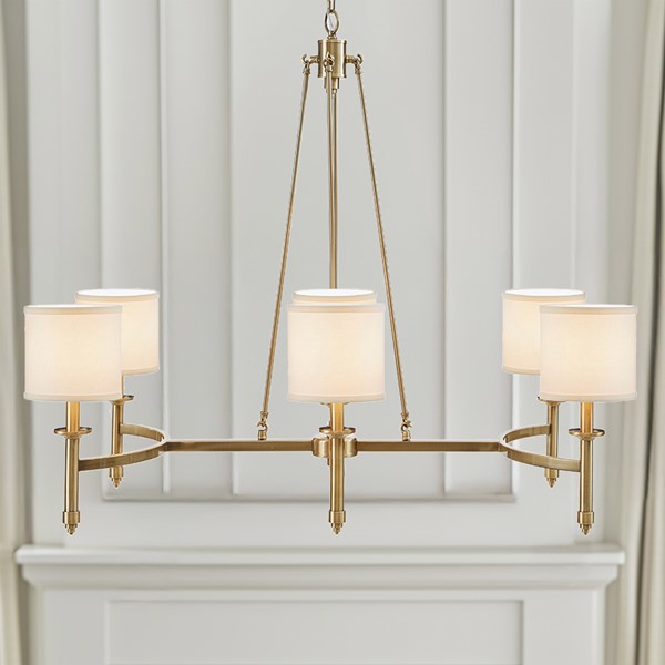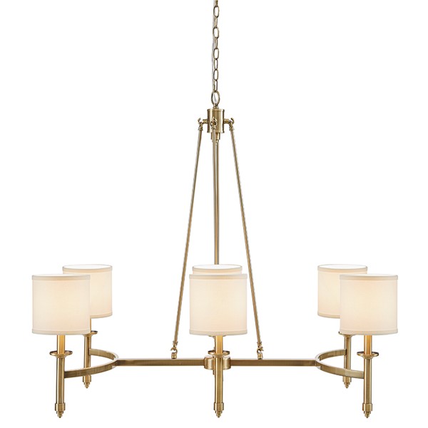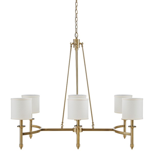 Introducing the Elegenza 6 Light Chandelier, a captivating fixture from Hampton Hill. This chandelier boasts an elegant transitional style with a modern touch, featuring a gracefully curved metal frame that adds sophistication to any room. It comes with 6 white cylindrical shades that provide a soft, diffused lighting effect to enhance the ambiance (bulbs not included). The adjustable chain allows for customized hanging heights, perfect for dining rooms, foyers, or living areas. All necessary mounting hardware is included for easy installation. Elevate your space with this stunning chandelier.