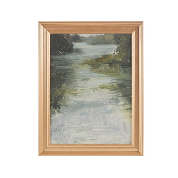 The Martha Stewart Estuary Abstract Landscape Framed Glass Wall Art by Artist Johanna Spinks, introduces a nature-inspired touch to your home decor. A roaring river meets the ocean to create this beautiful green and blue tone landscape, while the glass finish and gold frame detailing provide an elevated touch to the beautiful country design. Part of the Martha Stewart Urban Collection, this framed glass wall art measures 18.5×23.5" and features two D-rings on the reverse making it an easy picturesque addition to update your living room or home office.