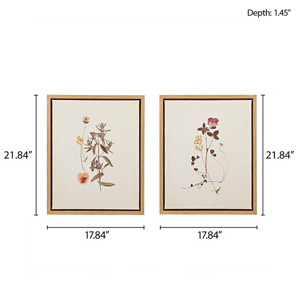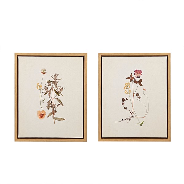 The Martha Stewart French Herbarium 2-piece Framed Canvas Wall Art Set by Artist Devon Ross adds the perfect cottage-inspired charm to your home decor. This 2 Piece Wall Art set showcases beautiful dainty wild flowers in soft feminine tones, while the linen ground provides a charming transitional look and cottage touch. Each piece is finished with a natural wood tone frame for a warm update and features a D-ring fixture on the reverse making them easy to hang. Measuring 17.8×21.8"; soften your space by incorporating this framed linen canvas into your bedroom, kitchen, or living room decor.