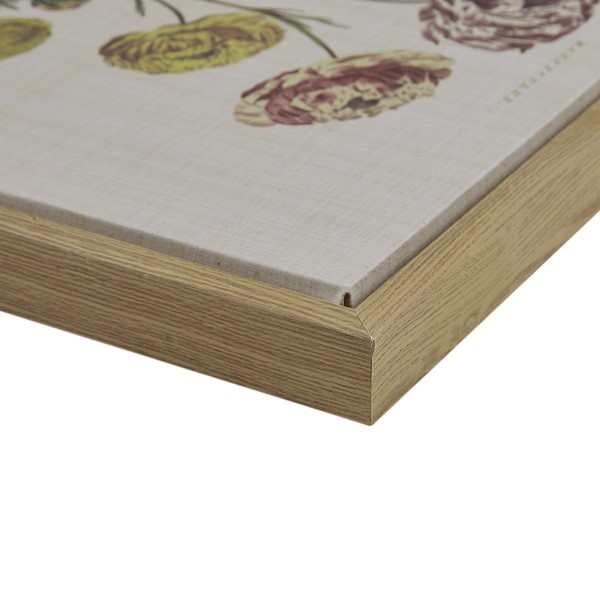 I searched for years to find the perfect botanical prints and background color for my French credenza, and finally found them in these pictures. The linen-like material, wood frames, and secure hooks make for a great product, and I love that they are not enclosed in glass.