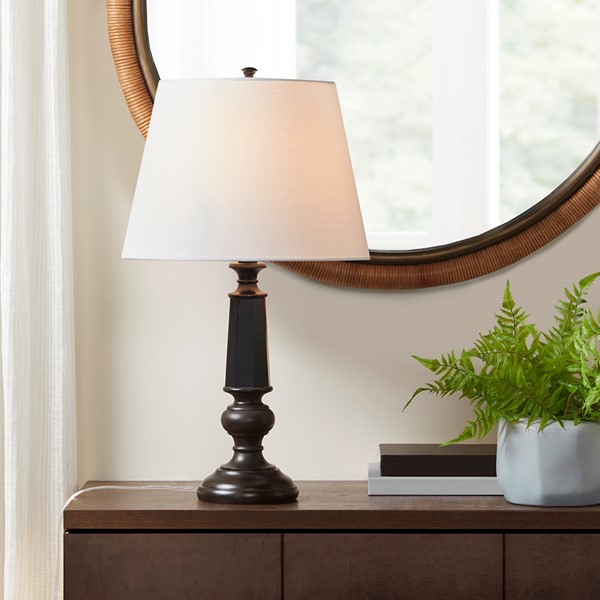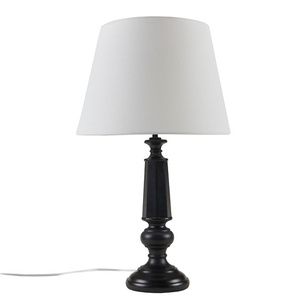 Landsdown 24.25"H faceted black table lamp is a part of Martha Stewart’s lily pond collection and is sure to light up any room in your home. The classic, traditional base design features a sculptural and faceted pedestal style in a high-gloss black finish and is paired with a tapered drum shaped light-colored shade. The lamp also includes an on/off rotary switch on socket and comes with 1 Type A, 9W LED light bulb. It has a polarized plug and is not dimmable. Spot clean only. 2 year limited warranty.