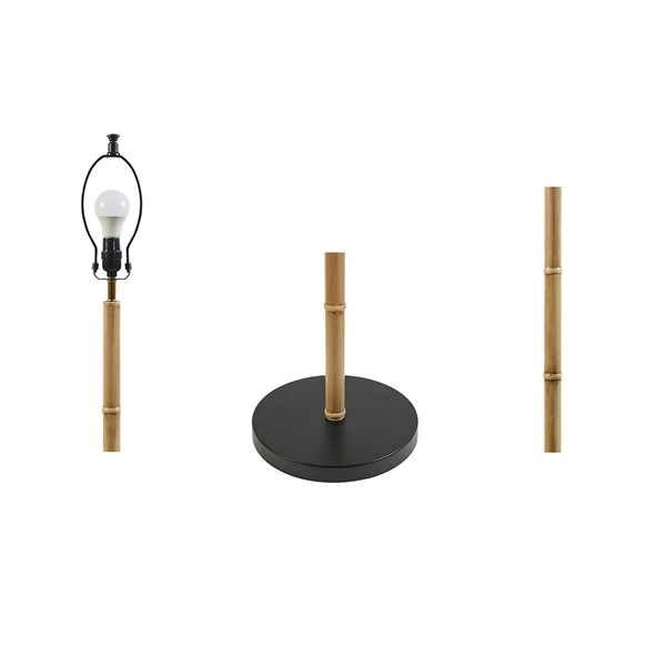 * Features a bamboo finish with a constrasting base and tapered drum shade in black color
