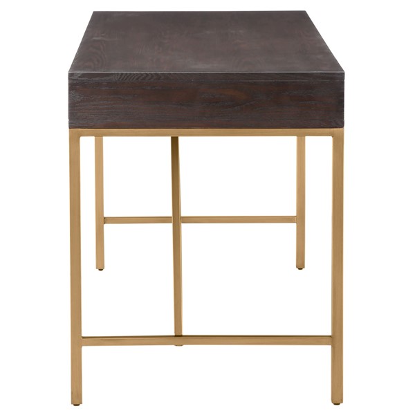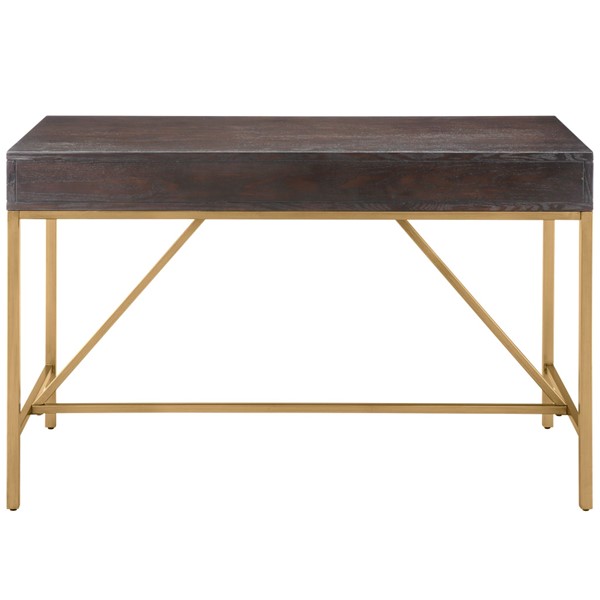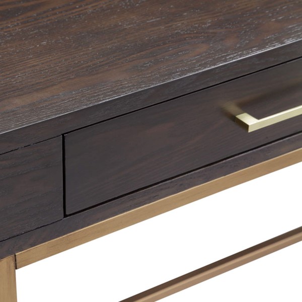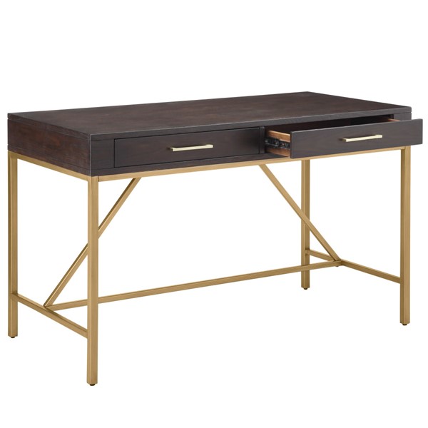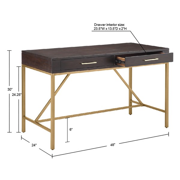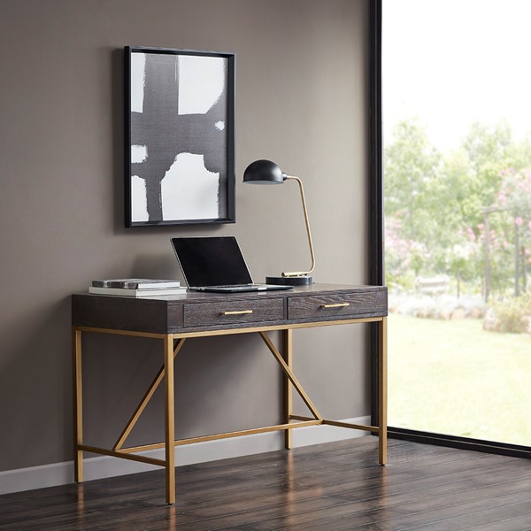 Complete your office decor with modern style of the Martha Stewart Sharkey Desk. This desk features a solid wood veneer top in a dark morocco finish and a gold metal frame, creating a stunning contrast. Two drawers with bar pulls provide storage space for your office supplies. With its simple and clean design, this desk brings a contemporary flair to your home office decor. Assembly is required and tools are included.