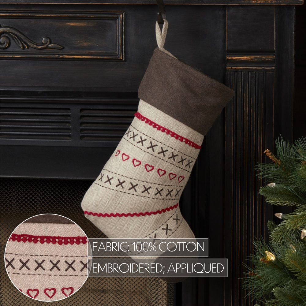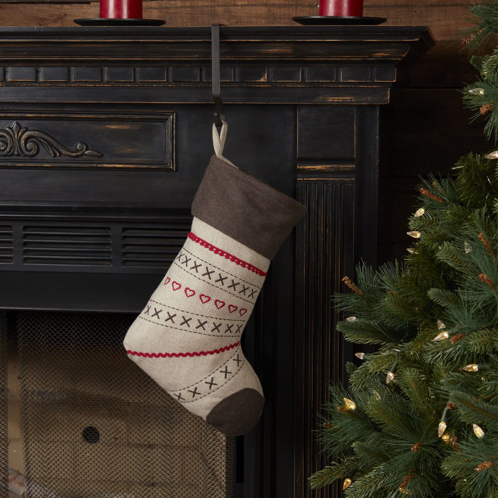Having a Merry Little Christmas just got easier with VHC Brands' farmhouse-inspired Christmas stocking. You'll fall in love with the soft khaki stocking, the chestnut brown cuff, and the cherry red hearts and cross stitches embroidery tastefully nestled between rice stitching, rick rack lacing, and pom pom lacing. Simply turn it inside-out to feature the same design minus the rick rack lacing for a more simplistic version.