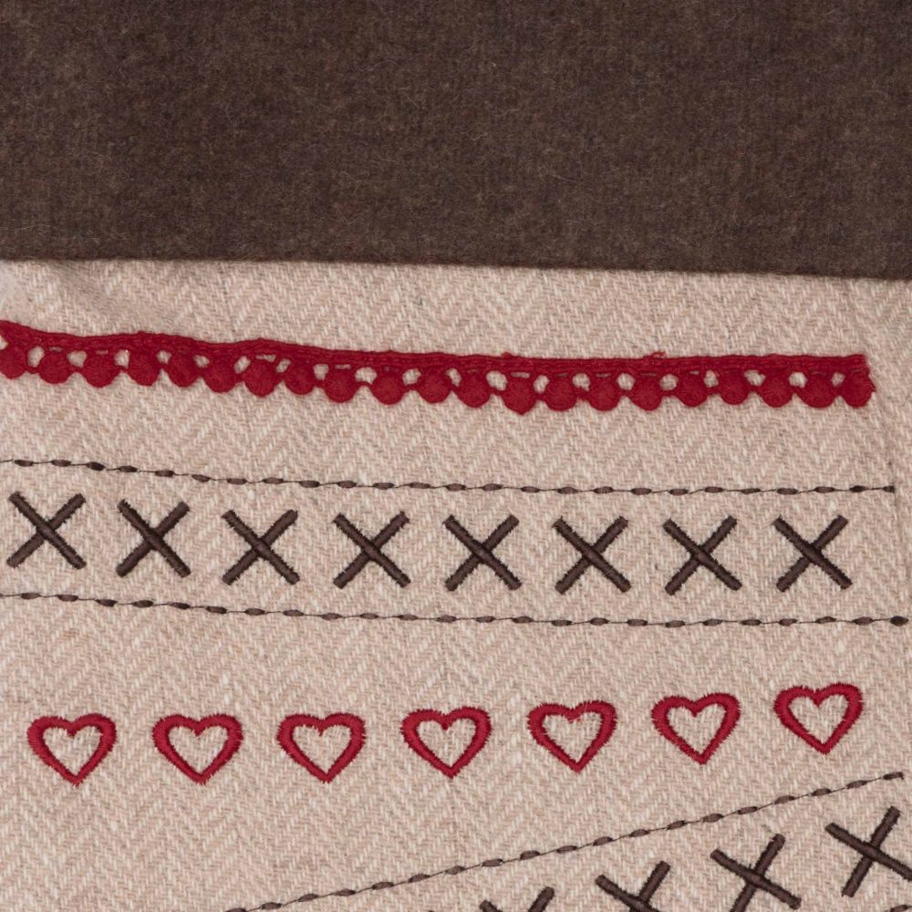 - FESTIVE Hearts and cross stitches enclosed with rice stitch accents featuring rick-rack and pom-pom lacing