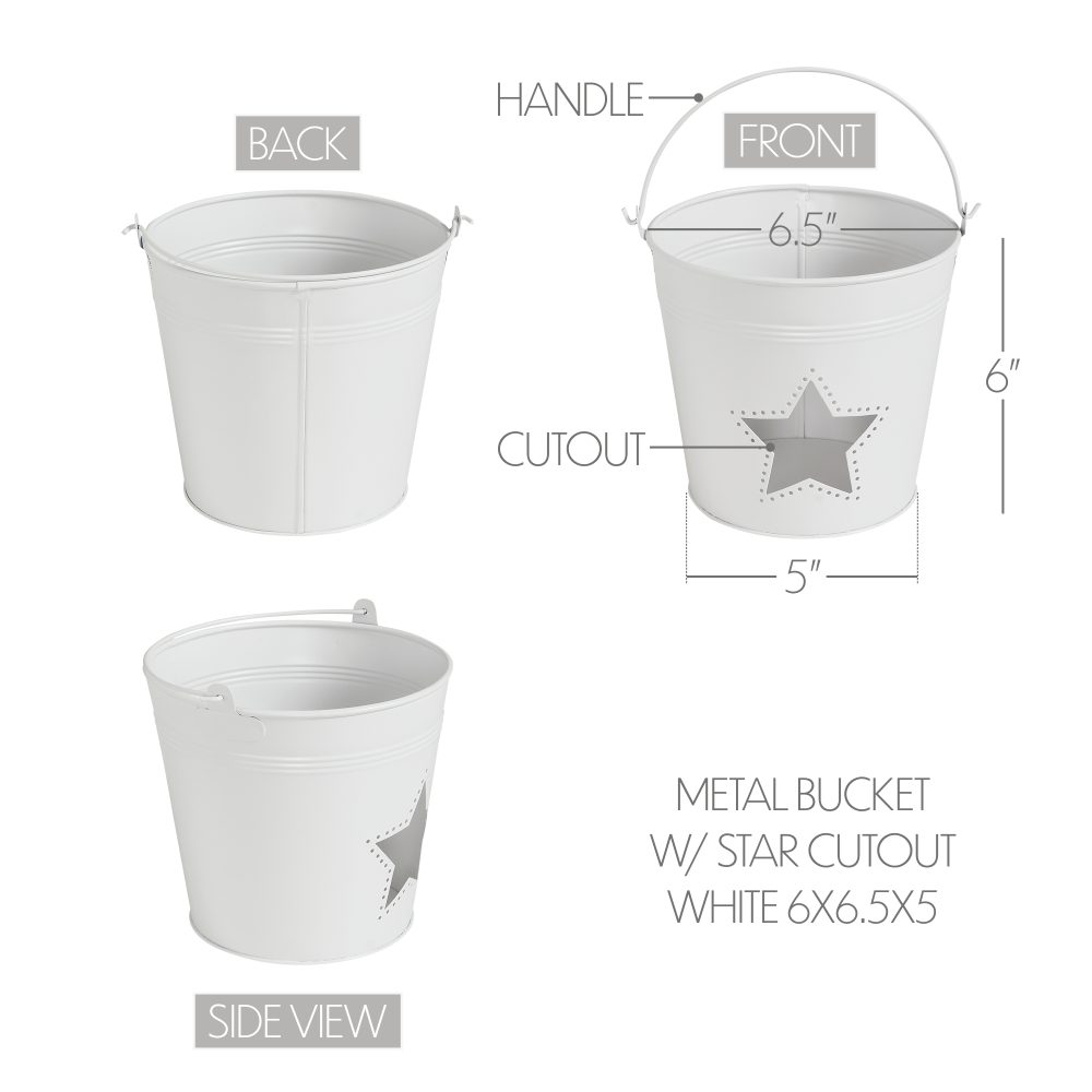 Bring a charming patriotic touch to your home with the VHC Brands Patriotic Metal Bucket w/ Star Cutout 6x6.5x5. This bright white decorative metal bucket features a 3-inch star cutout on the side, allowing a peek at its contents while adding a rustic Americana flair. The star is accented with small cutout holes around its edges for extra detail, and the bucket is finished with a sturdy metal handle for easy carrying or hanging. Perfect for Fourth of July celebrations or everyday decor, this versatile container enhances any space with its country-inspired design. Use it in your living room, dining room, kitchen, or entryway to hold small plants, seasonal decorations, or other decorative items. Its clean, classic look and functional size make it a stylish and practical accent for farmhouse, rustic, or Americana-themed interiors. Durably crafted from metal, the VHC Brands Patriotic Metal Bucket is designed for decorative use and is easy to maintain-just wipe clean with a soft cloth. Whether displayed as a centerpiece or paired with other patriotic decor, this bucket offers a timeless way to celebrate Independence Day and showcase your love for country throughout the year.