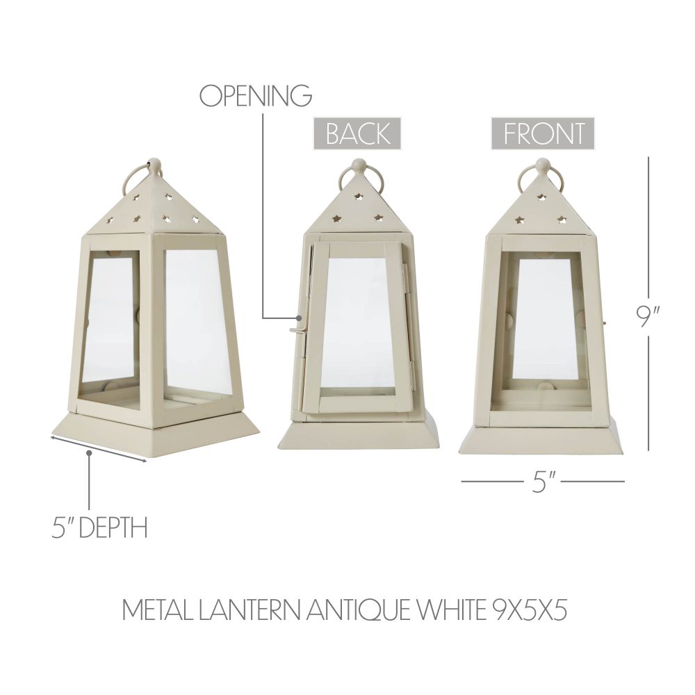 Add a touch of vintage charm to your home decor with the VHC Brands Metal Lantern Tealight Holder in Antique White. This exquisite piece features a metal lantern with glass windows adorned with charming star cutouts, creating a captivating display of light and shadow. Crafted from durable metal and glass, this lantern exudes primitive and rustic appeal, making it an ideal addition to kitchen, dining, or living room settings. Measuring 9x5x5 inches, it's perfectly sized to serve as a striking centerpiece or accent piece on your dining table, entryway console, or living room mantel. The timeless elegance of antique white adds a touch of sophistication to this lantern, enhancing its vintage-inspired aesthetic. Its solid color complements a wide range of decor styles, from farmhouse to country chic, while the sturdy construction ensures durability and longevity. To maintain its pristine appearance, simply wipe the lantern clean with a soft cloth as needed, ensuring it retains its allure for years to come. For safe use, it's important to adhere to the cautionary guidelines, avoiding touching or moving the holder while warm or when a candle is lit. Keep the lantern out of reach of children and away from flammable objects to prevent accidents. Illuminate your dining room, entryway, or living room with the warm, inviting glow emanating from the VHC Brands Metal Lantern Tealight Holder in Antique White, and infuse your home with rustic charm and timeless allure.