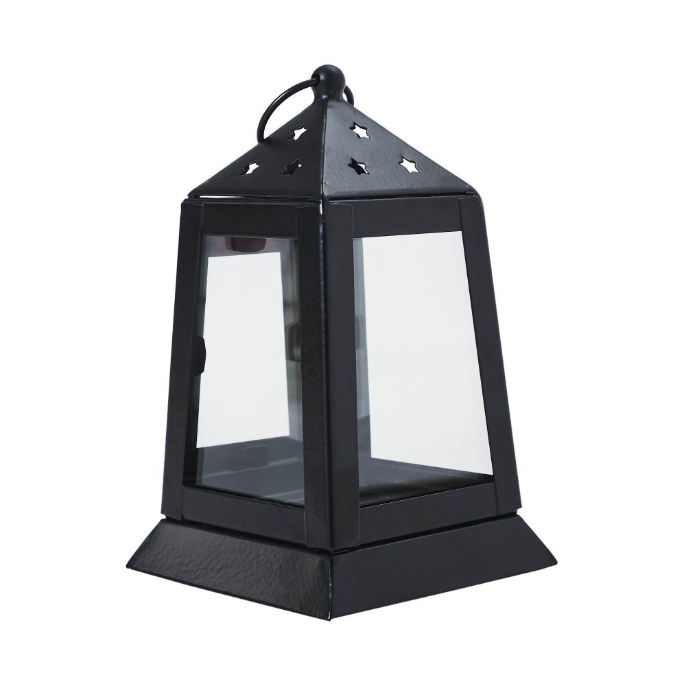 - Illuminate your home with a touch of rustic elegance using our Metal Lantern Tealight Holder in country black, crafted from durable metal and featuring charming glass windows and star cutouts, perfect for enhancing the ambiance of your kitchen, dining area, or living room.