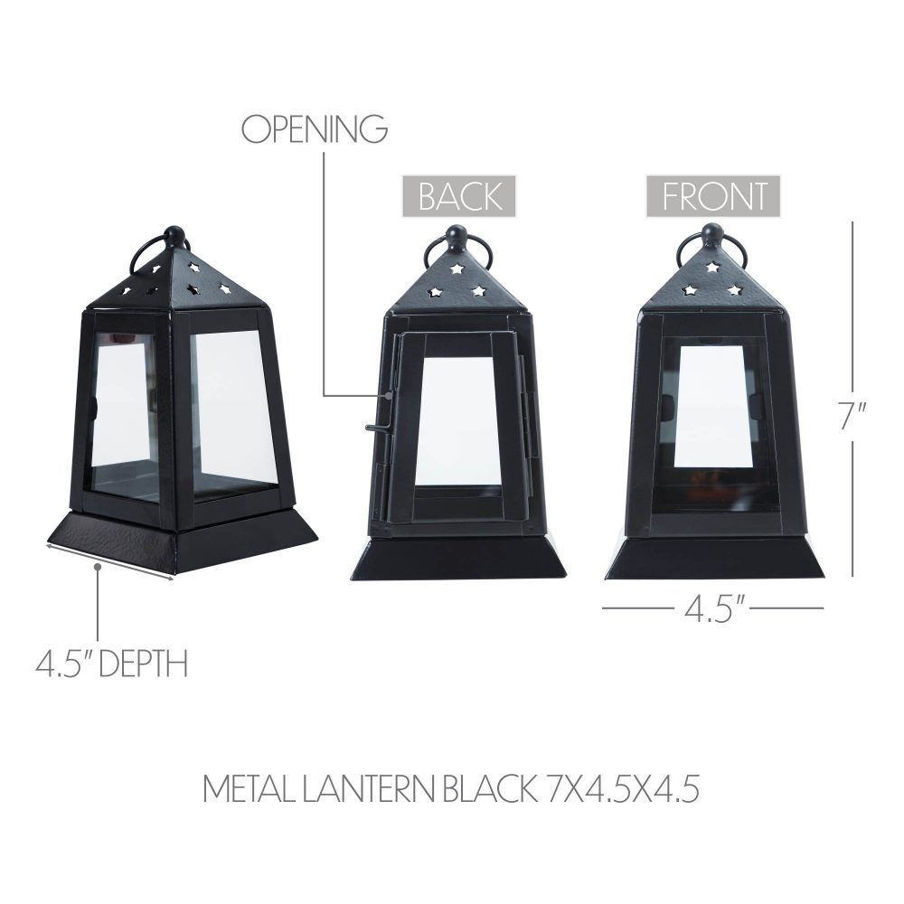 Elevate the ambiance of your home with the timeless elegance of the VHC Brands Metal Lantern Tealight Holder in Country Black. Crafted from durable metal and featuring glass windows adorned with charming star cutouts, this lantern exudes primitive and rustic charm, adding a touch of classic sophistication to any room. Measuring 7x4.5x4.5 inches, it's perfectly sized for placement on kitchen or dining tables, entryway consoles, or living room mantels, creating a captivating focal point in your home decor. The deep, rich hue of country black lends a sense of understated luxury to this lantern, making it a versatile accent piece that effortlessly complements various decor styles, from farmhouse-inspired to vintage rustic. Its solid color enhances its country lantern aesthetic, while the sturdy construction ensures durability and longevity. For convenient maintenance, simply wipe the lantern clean with a soft cloth to keep it looking fresh and inviting. To ensure safe use, it's essential to follow the cautionary guidelines, handling the lantern with care, especially when warm or when a candle is lit. Keep it out of reach of children and away from flammable objects to prevent accidents. Illuminate your dining room, entryway, or living room with the warm, inviting glow emanating from the VHC Brands Metal Lantern Tealight Holder in Country Black, and infuse your home with rustic charm and timeless allure.