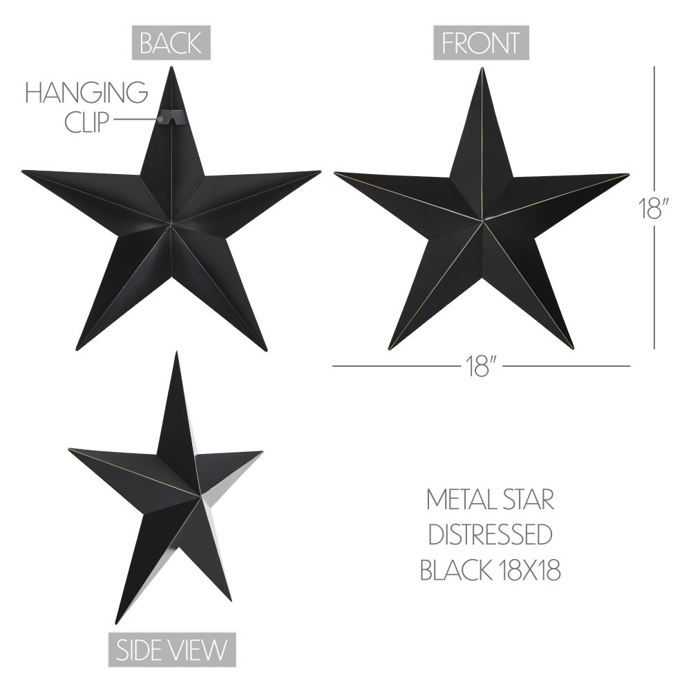 Elevate your home decor with the VHC Brands Patriotic Metal Star, an 18x18 decorative wall hanging that exudes rustic elegance and timeless charm. This faceted five-point star is made from sturdy metal, finished in a rich country black with vintage tan distressing along the ridges for an authentically weathered look. A convenient hanging clip at the back allows for effortless display, making it the perfect accent piece for patriotic holidays or year-round farmhouse-style decorating. Versatile and stylish, this decorative star enhances any room in your home, including the living room, dining room, kitchen, bedroom, bathroom, or entryway. Its neutral yet bold color palette blends seamlessly with a variety of decor styles, from rustic and country to vintage-inspired interiors. Although designed primarily for indoor use, it can also be displayed outdoors with the application of a protective sealant, adding character to porches or gardens. Maintaining the VHC Brands Patriotic Metal Star is simple-just wipe it clean with a soft cloth to keep it looking its best. Its larger size makes it a striking focal point, whether showcased as part of a gallery wall or as a standalone statement piece. Whether you're celebrating Independence Day or adding a touch of country charm to your home, this decorative metal star delivers quality craftsmanship and enduring appeal.