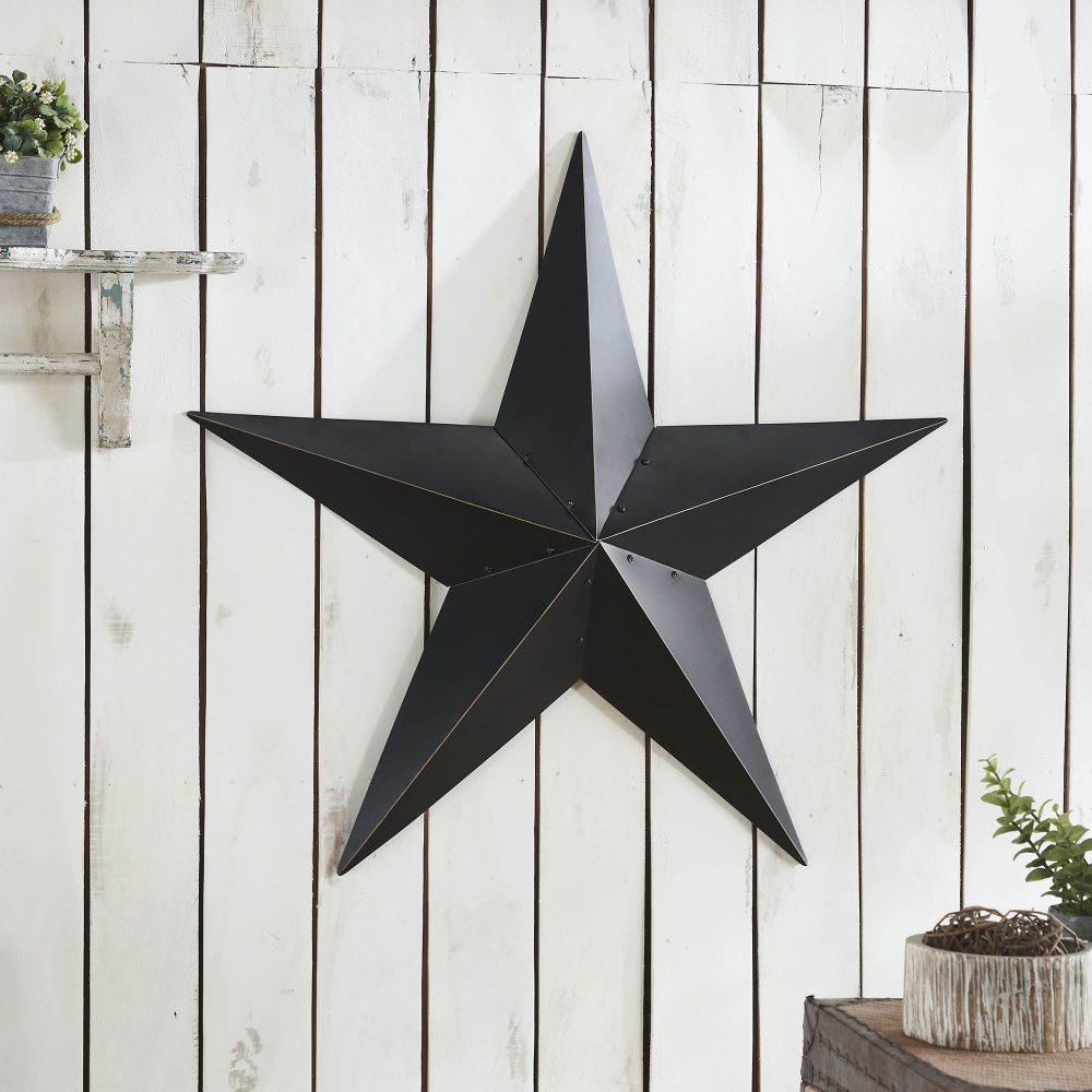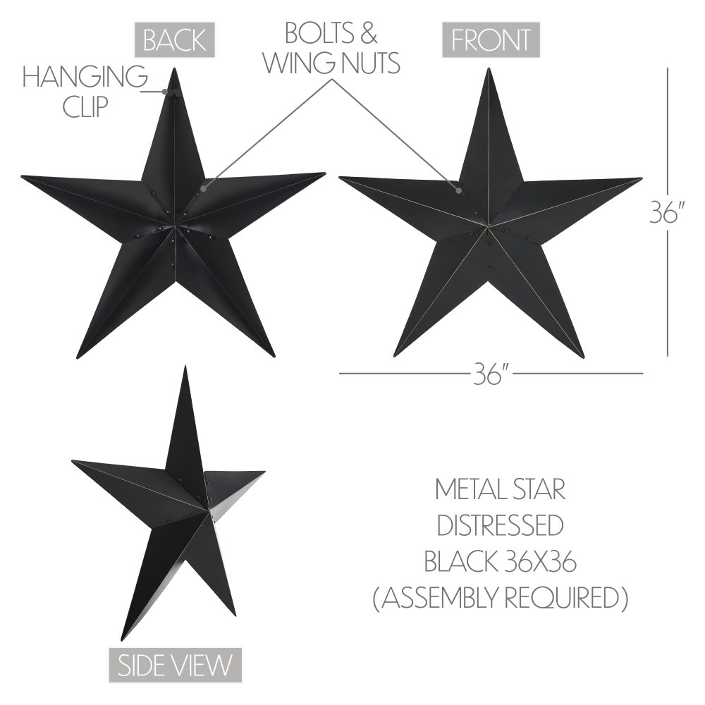 Make a bold design statement with the VHC Brands Patriotic Metal Star, a stunning 36x36 decorative wall hanging that blends rustic farmhouse charm with timeless elegance. This oversized five-point star is crafted from durable metal and features a country black finish with vintage tan distressing along the ridges, giving it a beautifully weathered and aged appearance. Its substantial size and faceted design make it a striking focal point for any room or outdoor space. Perfect for enhancing your living room, dining room, kitchen, bedroom, bathroom, or entryway, this versatile star fits seamlessly into country, rustic, or farmhouse decor styles. Designed primarily for indoor use, it can also be displayed outdoors with the application of a protective sealant, adding character to porches or garden walls. Assembly is required, with each arm carefully wrapped for protection during shipping and all necessary hardware included for a straightforward setup. Maintaining the VHC Brands Patriotic Metal Star is effortless-simply wipe it clean with a soft cloth to preserve its distressed finish and timeless appeal. Its grand size and bold color palette make it an eye-catching addition to your Independence Day decor or an elegant year-round accent. Whether showcased as a standalone piece or incorporated into a larger design arrangement, this decorative metal star exudes craftsmanship, charm, and enduring style.