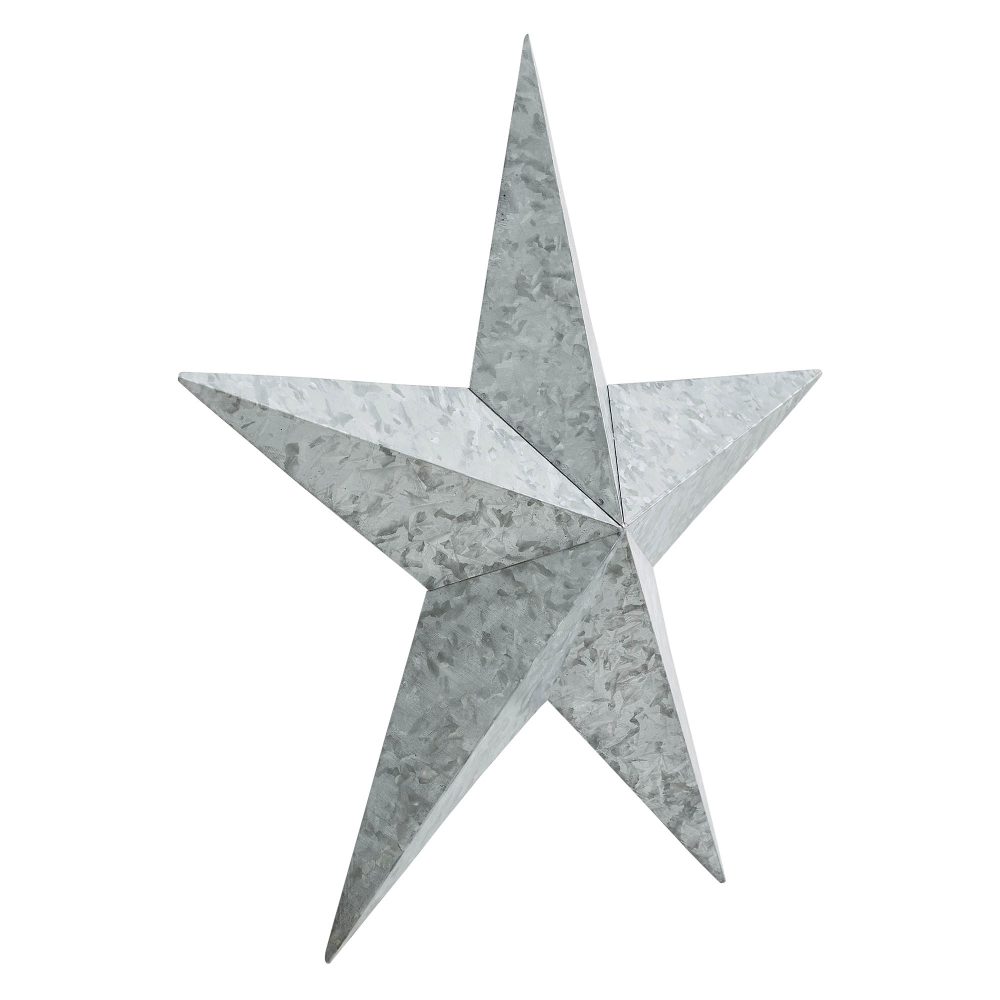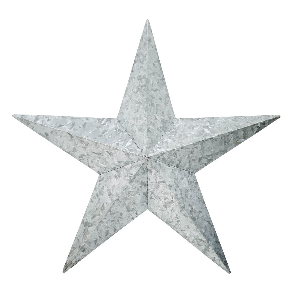 Bring timeless style and rustic charm to your home with the VHC Brands Patriotic Metal Star Galvanized 18x18, a decorative wall hanging perfect for adding a farmhouse-inspired touch to your space. This faceted five-point star is crafted from durable metal with a galvanized grey finish, offering a sleek yet weathered look that blends seamlessly with a variety of decor styles. A convenient hanging clip on the back makes it easy to display, providing a simple way to elevate your home's aesthetic. Ideal for indoor use, this versatile decorative star is designed to complement a range of spaces, including the living room, dining room, kitchen, bedroom, bathroom, or entryway. Its galvanized grey finish enhances rustic, farmhouse, and country-inspired interiors, making it a perfect addition to Independence Day celebrations or year-round decor. For outdoor display, applying a protective sealant will help preserve its finish, allowing it to shine on porches or patios. Caring for the VHC Brands Patriotic Metal Star is effortless-simply wipe it clean with a soft cloth to maintain its sleek, galvanized appearance. Its medium size makes it a perfect centerpiece or accent, whether displayed as a standalone piece or as part of a larger arrangement. Combining quality craftsmanship with a timeless design, this decorative metal star is a stylish and durable addition to your home decor.