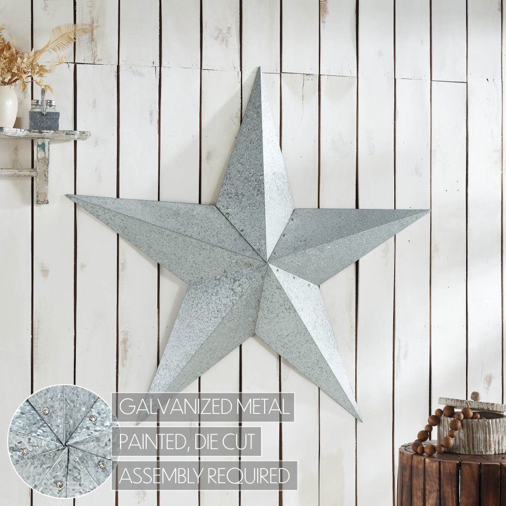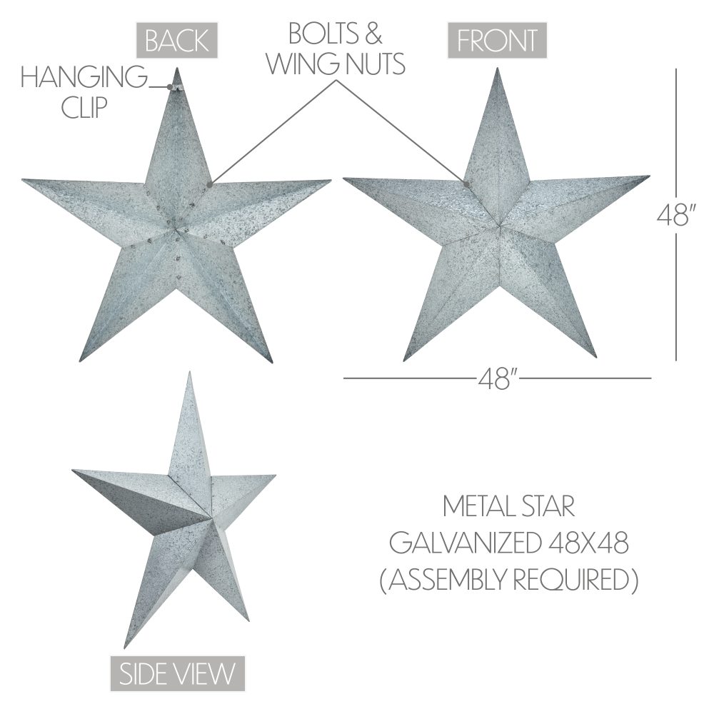 Create a stunning focal point in your home with the VHC Brands Patriotic Metal Star Galvanized 48x48, an oversized decorative wall hanging that exudes rustic charm and timeless elegance. This faceted five-point star is crafted from durable metal and features a sleek galvanized grey finish, offering a stylish yet weathered look that complements a variety of decor styles. Equipped with a convenient hanging clip at the back, it's designed for effortless placement to enhance your Independence Day decor or year-round farmhouse aesthetic. Perfect for large spaces, this decorative star adds character and sophistication to living rooms, dining rooms, kitchens, bedrooms, bathrooms, or entryways. Its galvanized grey finish blends seamlessly with rustic, country, and modern farmhouse interiors, making it a versatile and bold addition. For outdoor use, applying a protective sealant ensures the star's finish and durability are preserved, making it a striking feature on porches or patios. Assembly is required for this grand piece, with each arm carefully wrapped for protection during shipping and all necessary hardware included for easy setup. Maintaining the VHC Brands Patriotic Metal Star is simple-just wipe it clean with a soft cloth to retain its sleek, galvanized appearance. Whether displayed as a dramatic standalone centerpiece or as part of a larger decorative arrangement, this oversized metal star combines quality craftsmanship and timeless design to elevate your home decor.