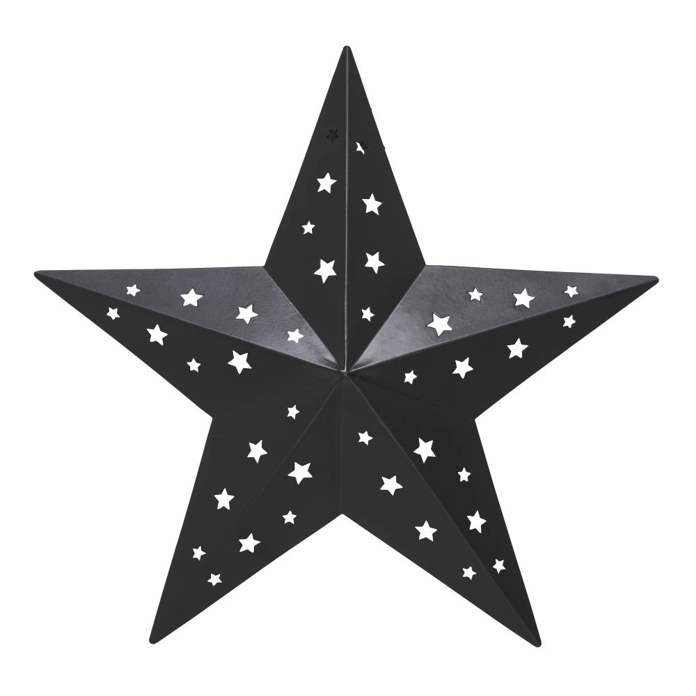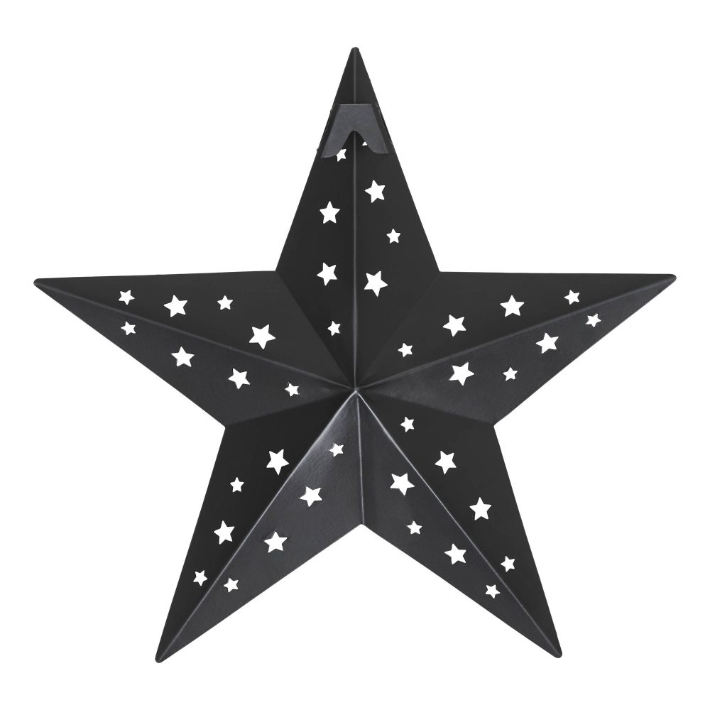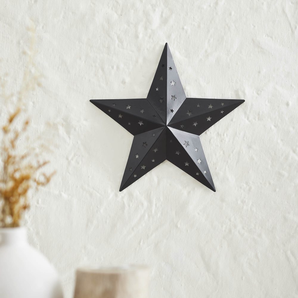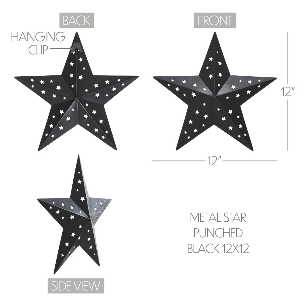 Enhance your farmhouse decor with the VHC Brands Metal Star Punched Black 12x12 wall hanging. This striking 5-point star features a coal black finish and is uniquely designed with multi-sized scattered stars punched through the metal, allowing light to shine through for a captivating effect. Its bold design makes it an excellent accent for any space, perfect for those who appreciate country aesthetics. This versatile wall art is ideal for a variety of settings, including the living room, bedroom, bathroom, or kitchen. The deep black color adds a touch of sophistication while complementing a wide range of decor styles. Whether displayed alone or combined with other decorative elements, this star brings warmth and character to your home. For easy maintenance, simply wipe the star clean with a soft cloth to keep it looking fresh. Although designed primarily for indoor use, applying a sealant will enable outdoor display, ensuring its durability against the elements. This beautiful metal star not only serves as a stylish decorative piece but also embodies the inviting spirit of country living, making it a perfect addition to your entryway or any cherished space.