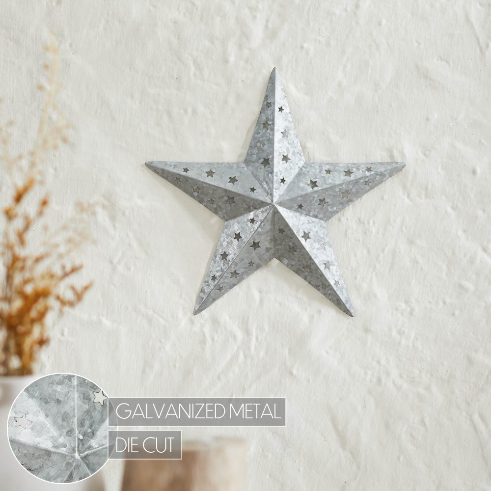 Enhance your home's rustic charm with the VHC Brands Metal Star Punched Galvanized 12x12 wall hanging. This striking 5-point star features a galvanized grey finish and is designed with multi-sized scattered stars punched through the metal, allowing light to shine through for a captivating display. Its unique design makes it an excellent accent piece for anyone who appreciates farmhouse decor. This versatile wall art is perfect for various spaces, including the living room, bedroom, bathroom, or kitchen. The industrial look of the galvanized finish complements a range of decor styles, adding character and warmth to your home. Whether hung on its own or as part of a curated collection, this star brings a welcoming touch to any room. For easy maintenance, simply wipe the surface clean with a soft cloth to keep it looking fresh. While designed primarily for indoor display, applying a sealant allows for outdoor use, ensuring durability against the elements. This charming metal star not only serves as a stylish decorative piece but also embodies the inviting spirit of country living, making it a perfect addition to your entryway or any cherished space.