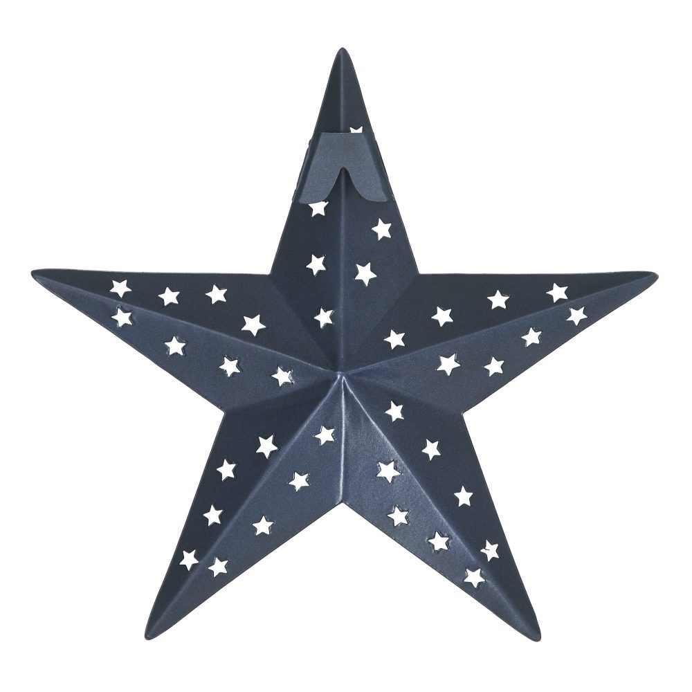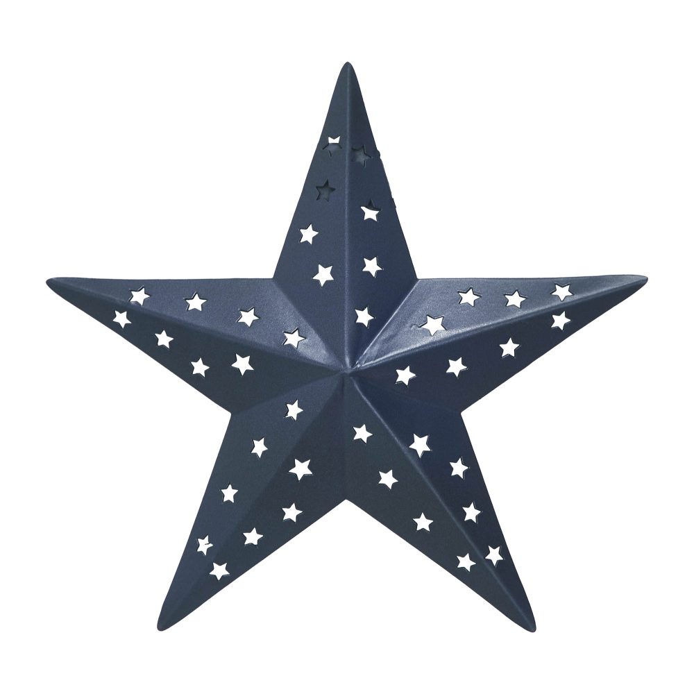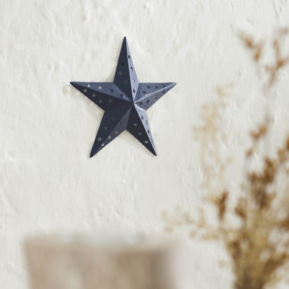 Elevate your farmhouse decor with the VHC Brands Metal Star Punched Navy 6x6 wall hanging. This striking 5-point star features a deep navy finish and is adorned with multi-sized scattered stars that are cleverly punched through the metal, allowing light to filter through for a captivating effect. Its unique design adds a touch of rustic elegance to any space, making it a delightful accent for those who love country aesthetics. Perfect for a variety of settings, this versatile wall art can enhance the look of your living room, bedroom, bathroom, or kitchen. The navy color complements a wide range of decor styles, creating a warm and inviting atmosphere in your home. Whether displayed on its own or as part of a decorative arrangement, this star brings charm and character to your interior. For easy upkeep, simply wipe the star clean with a soft cloth to maintain its beauty. While designed primarily for indoor use, you can apply a sealant for outdoor display, ensuring it stands up to the elements. This charming metal star not only serves as a stylish decorative piece but also embodies the welcoming spirit of farmhouse living, making it a perfect addition to your entryway or any beloved space.