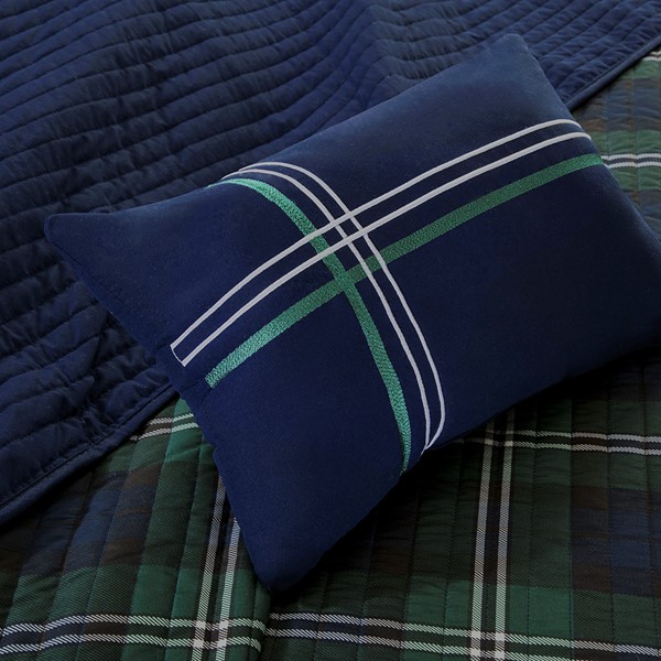 Add a sophisticated style to your bedroom with the Mi Zone Brody Reversible Quilt Set. This quilt and 2 shams (1 in Twin/TwinXL) features a blue and green plaid pattern with a solid blue reverse, creating a handsome cabin-inspired look. The quilted filling is pre-washed cotton for maximum comfort and durability. Completing this plaid quilt is 1 oblong decorative pillow that pairs perfectly with the top of the bed. Machine washable for easy care, this reversible quilt set uses an antimicrobial treatment that provides built-in freshness protection, reducing the growth of odor causing bacteria to keep fabric lasting longer. Items in the set may come in a rolled or compressed packaging, which will need to be fluffed up or steam ironed before use to remove wrinkles.