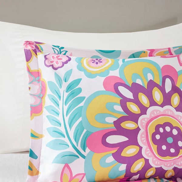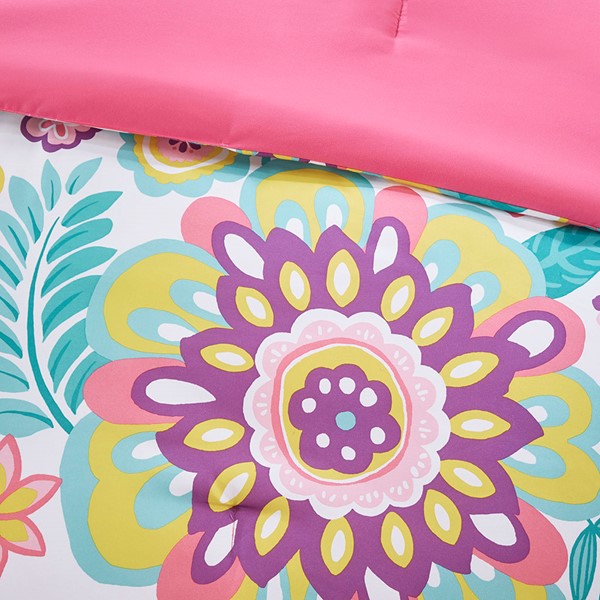 Brighten your bedroom with the fun and colorful style of the Mi Zone Camille Floral Comforter Set. The bright comforter and shams (1 in Twin/TwinXL) features a vibrant medallion flower print with a solid pink reverse, creating an adorable look. A round floral decorative pillow with embroidery complements the comforter set and adds the finishing touch. This bedding set uses an antimicrobial treatment that provides built-in freshness protection, reducing the growth of odor causing bacteria to keep fabric lasting longer.