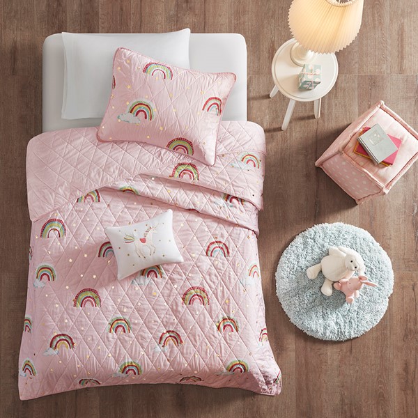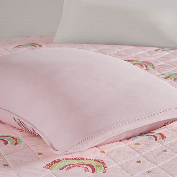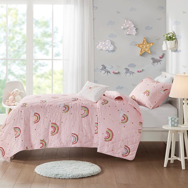 Bring a whimsical charm to your girl’s bedroom with the Mi Zone Kids Alicia Rainbow with Metallic Printed Stars Reversible Quilt Set. An adorable rainbow and gold metallic star print adorns the pink quilt and 2 shams (1 in Twin/TwinXL) for a cute and playful look. The solid pink reverse complements the entire ensemble and adds a soft pop of color. The oblong decorative pillow features an embroidered unicorn and provides a fun finishing touch to this kid’s quilt. Ideal for use in the summer, this kid’s quilt offers an extra layer of warmth in the winter. Cotton-rich filling in the quilted quilt and hypoallergenic polyester filling in the decorative pillow provide extra softness and comfort. Pre-washed for extra softness, this kid’s quilt set brightens up your child’s bedroom with its delightful allure and is machine washable for easy care. This bedding set uses an antimicrobial treatment that provides built-in freshness protection, reducing the growth of odor causing bacteria to keep fabric lasting longer. Items in the set may come in a rolled or compressed packaging, which will need to be fluffed up or steam ironed before use to remove wrinkles.