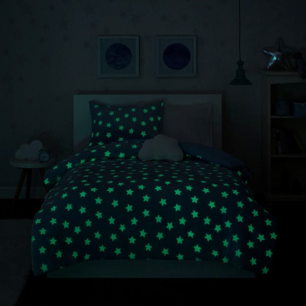 Sleep under the stars with the Mi Zone Kids Quinny Glow in the Dark Plush Comforter Set. The plush aqua comforter and shams (1 in Twin/TwinXL) feature glow-in-the-dark stars to create a whimsical look that bathes your kid’s room in starlight. A cloud-shaped decorative pillow is also included to complete the incredibly soft glow-in-the-dark bedding set. Soft and cozy, this glow-in-the-dark plush comforter set brings a fantastically fun addition for your child’s bedroom. Expose bedding to a light source and then turn off the lights to watch the stars glow! This bedding set is also OEKO-TEX certified, meaning it does not contain any harmful substances or chemicals to ensure quality comfort and wellness.