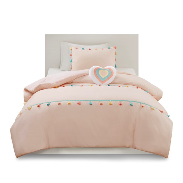 The Mi Zone Kids Tessa comforter features multi-colored tassels that add a charming detail to this bedding set. Cute and simple, the comforter offers a fun update to your kid’s bedroom, while coordinating shams (1 in Twin) and a heart-shaped decorative pillow with embroidery provide an adorable finishing touch to the bedding set. The hypoallergenic polyester comforter and decorative pillow filling contains no allergens and is treated to be dustproof. Machine washable for easy care, this comforter set is sure to brighten your kid’s bedroom decor. This bedding set is also OEKO-TEX certified, featuring an antimicrobial treatment, which keeps the bedding fresher longer.