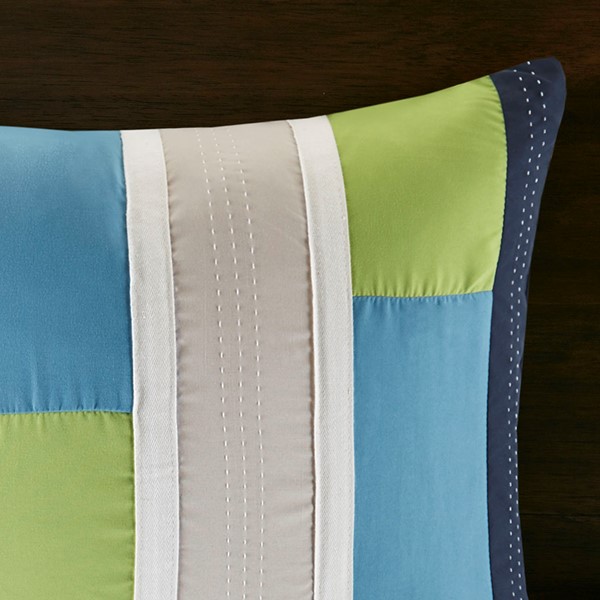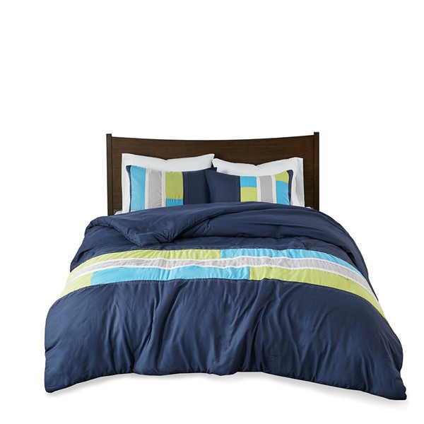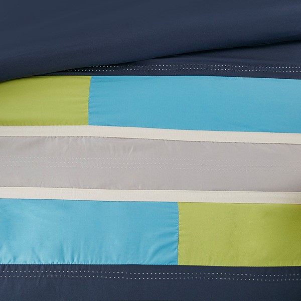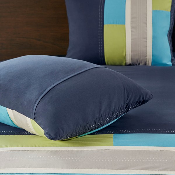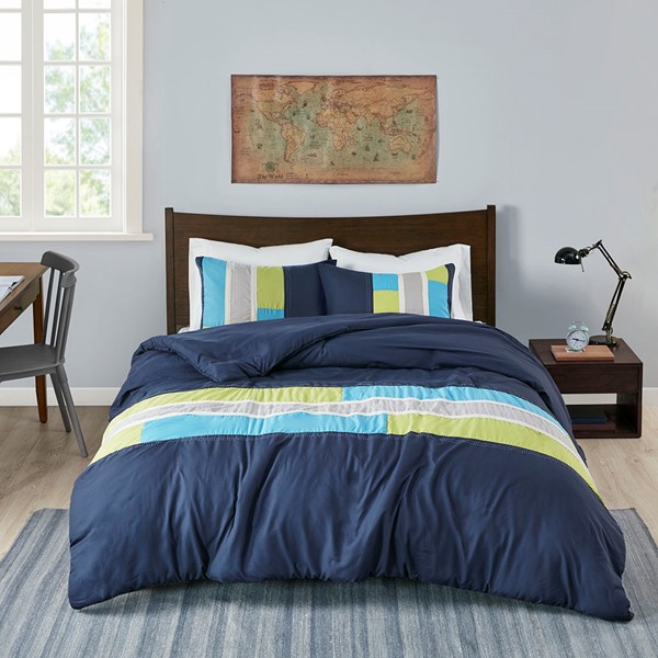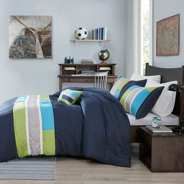 The Mi Zone Pipeline Duvet Cover Set offers a fresh update to your room. The ultra-soft microfiber duvet cover boasts a striped pieced design in bold colors, for a casual look with an urban feel. Top stitching and twill tape details highlight the design, creating an eye-catching contrast. Coordinating shams (1 in Twin/TwinXL) reiterate the duvet cover’s design, while two decorative pillows use embroidered details and fabric manipulation to complete the slick ensemble. Machine washable for easy care, this duvet cover set provides a fun and stylish update to your bedroom. Button closures allows you to place a down comforter insert inside the duvet cover for added warmth and comfort. This bedding set also uses an antimicrobial treatment that provides built-in freshness protection, reducing the growth of odor causing bacteria to keep fabric lasting longer.