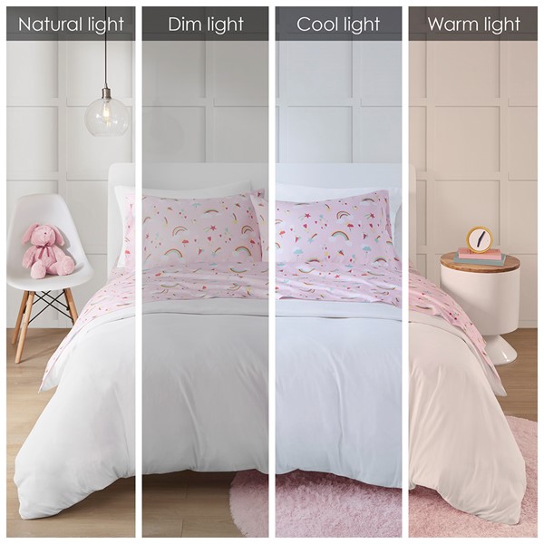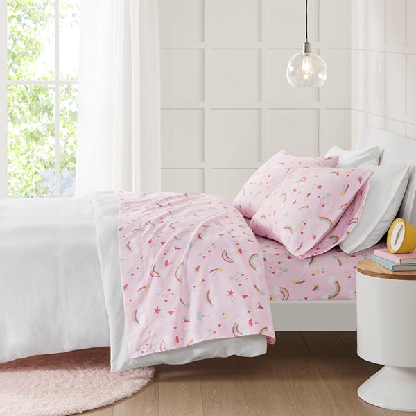The Mi Zone Printed Sheet Set brings a delightful and charming update to your child’s bedroom. This ultra-soft microfiber sheet set is naturally wrinkle-free and features an adorable rainbow on a pink background, to create an enticing and delectably sweet look. These novelty sheets are also OEKO-TEX certified, meaning they do not contain any harmful substances or chemicals, ensuring quality comfort and wellness. Set includes: 1 Flat Sheet, 1 Fitted Sheet, and 2 Pillowcases (1 in Twin).