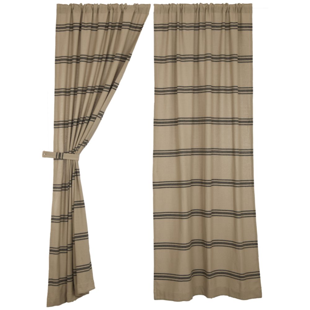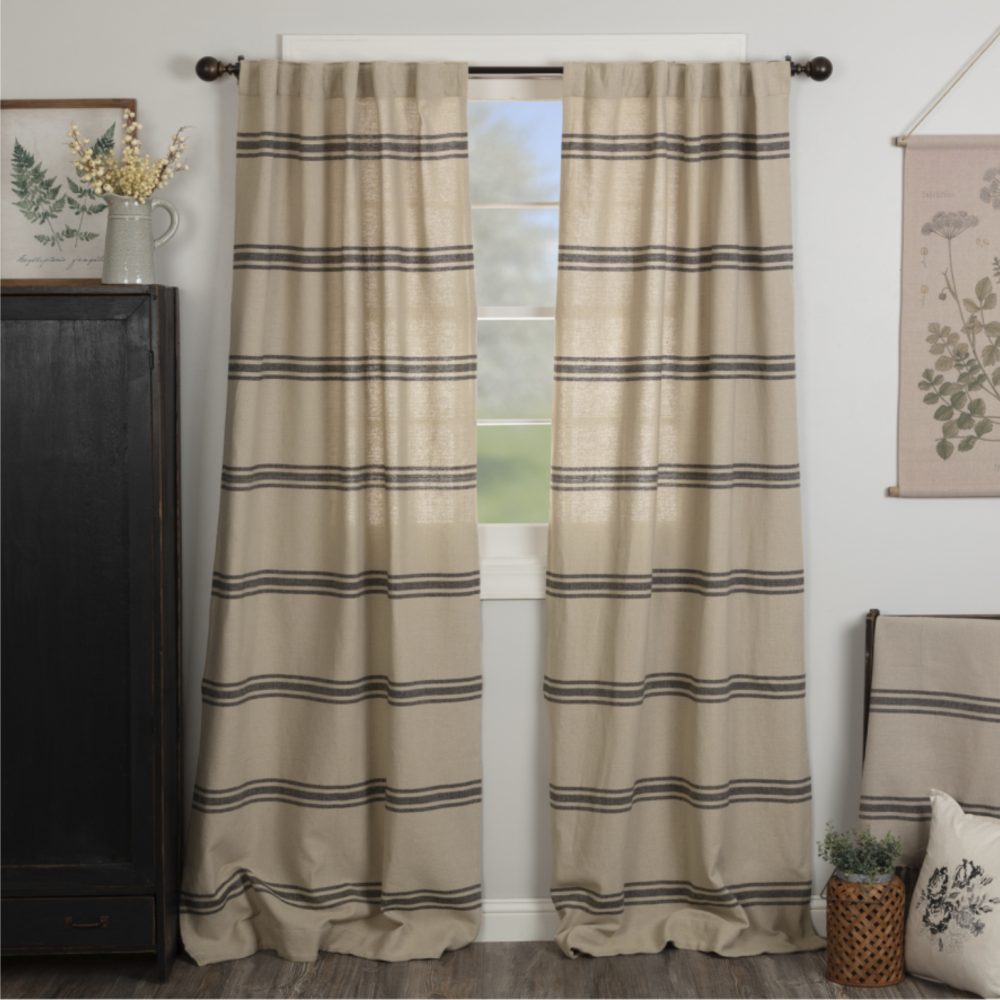 The Mill House Collection brings old-fashioned cottage charm to your farmhouse with the simplicity of homespun fabric and timeless grain sack stripes. The heavy-weave material features a rustic texture that softens every setting, adding warmth along with an easy-going, casual style. The neutral background is cool and collected, allowing the soft black stripes to round out the design. The charming, unsophisticated style of our original Mill House Collection is sure to strike a chord with farmhouse enthusiasts everywhere! The panel curtains add simplicity and softness to your windows with a wonderful, rich texture and multiple sets of stripes. The repeating horizontal lines on the panel curtains offer visual calmness and balance, that ground your room, and the unlined, single-layer fabric keeps the drapes rustic and relaxed. The look stays crisp and clean with no header, while two hanging options; a 3.25 rod pocket as well as fabric loops, offer different display choices.
