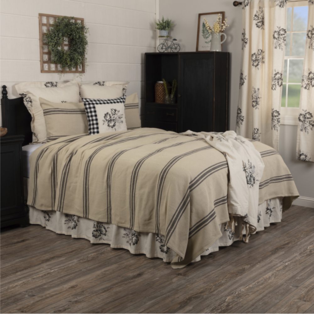 The Mill House Collection brings old-fashioned cottage charm to your farmhouse with the simplicity of homespun fabric and timeless grain sack stripes. The heavy-weave material features a rustic texture that softens every setting, adding warmth along with an easy-going, casual style. The neutral background is cool and collected, allowing the soft black stripes to round out the look with a balanced, repetitive design. The charming, unsophisticated style of our original Mill House Collection is sure to strike a chord with farmhouse enthusiasts everywhere! The coverlet bedding adds simplicity and softness to your bedding ensemble with wonderful texture and multiple sets of stripes. The repeating horizontal lines offer a lovely graphic look while visually grounding your room and creating a calm, secure space. A single-layer cotton fabric without embellishment along with the linear design offer up a masculine style, with a relaxed and rustic flair.