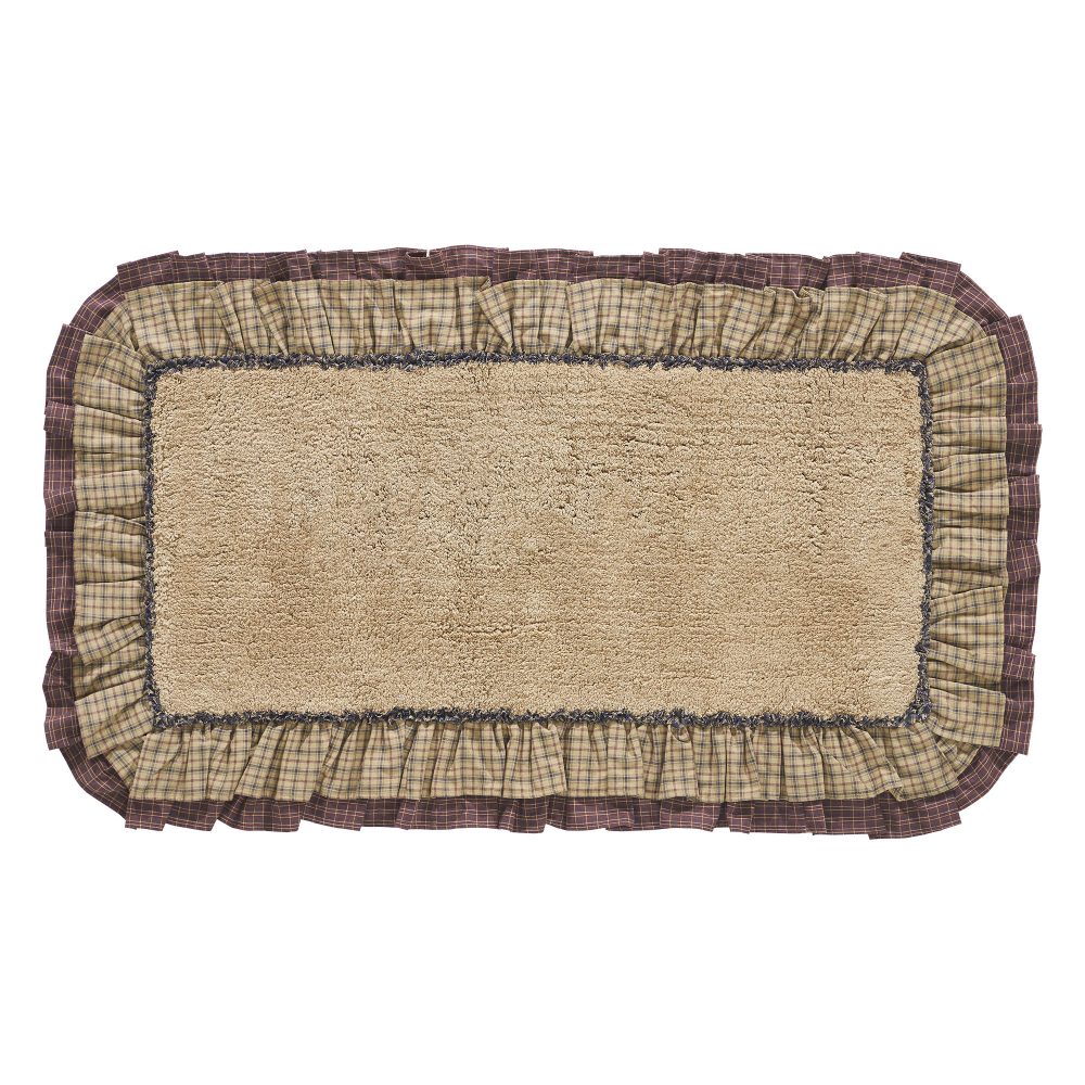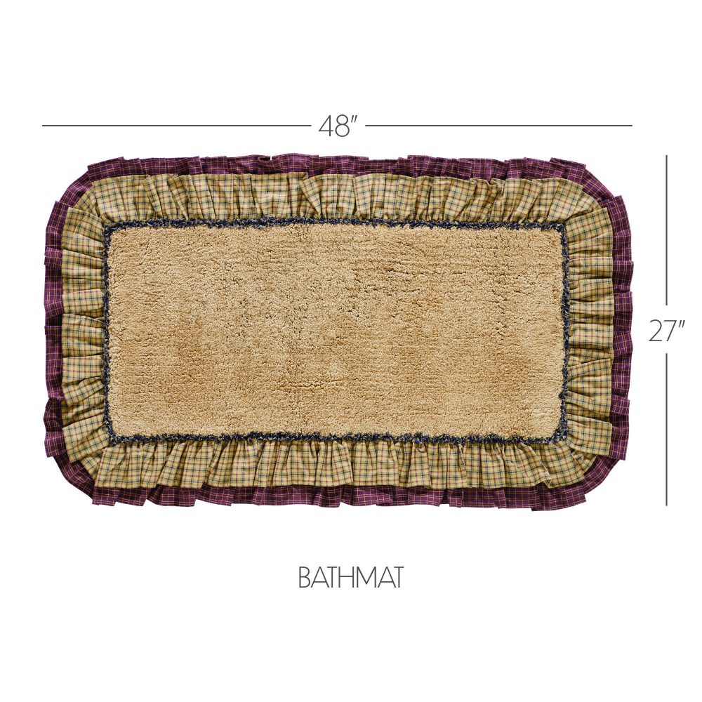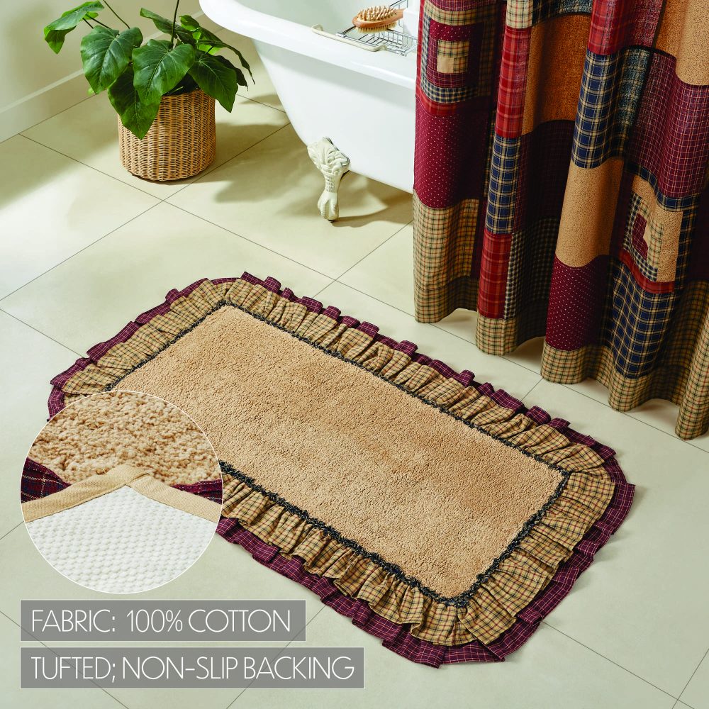 Step out of the shower and into cozy country bliss. The Millsboro Bath Mat 27x48 features a solid tan core in premium, ultra absorbent cotton. It is trimmed with a ruffled plaid fabric in deep khaki and navy blue layered over a second plaid in burgundy and creme. Backed with textured rubber to produce a quality, non-slip surface without the need for a separate rug pad. This ruffled bath mat is a great finishing piece for bathrooms or laundry rooms where you need the perfect balance of style and functionality.