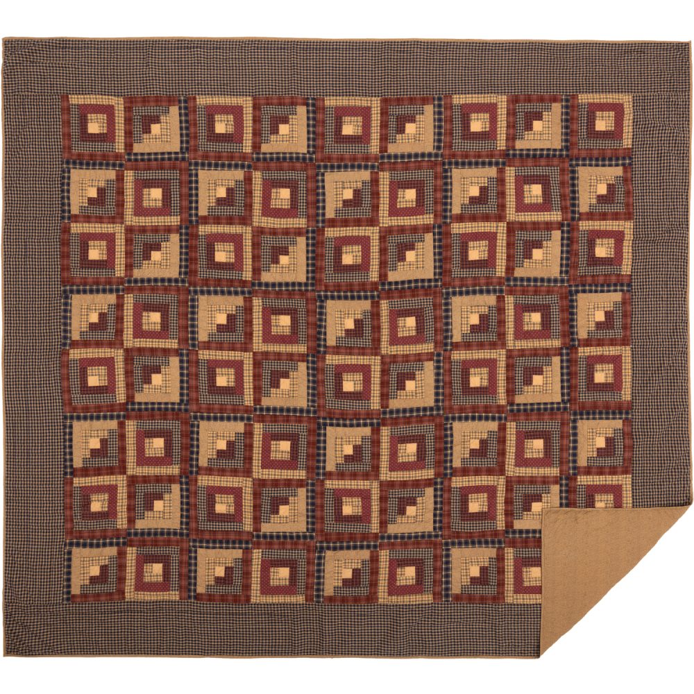 Add beautiful, primitive style to your bedding with a log cabin design with a simple plaid border. The Millsboro King Quilt measures 110x97 inches and is constructed with 100 percent cotton. Burgundy red, tan and navy blue form muted plaid patterns that enhance the soft, comforting style of the bedspread. Reverses to a soothing tan ditsy floral for alternate styling. Coordinates with the Millsboro Collection by VHC for relaxed style and primitive country detailing for the whole home.