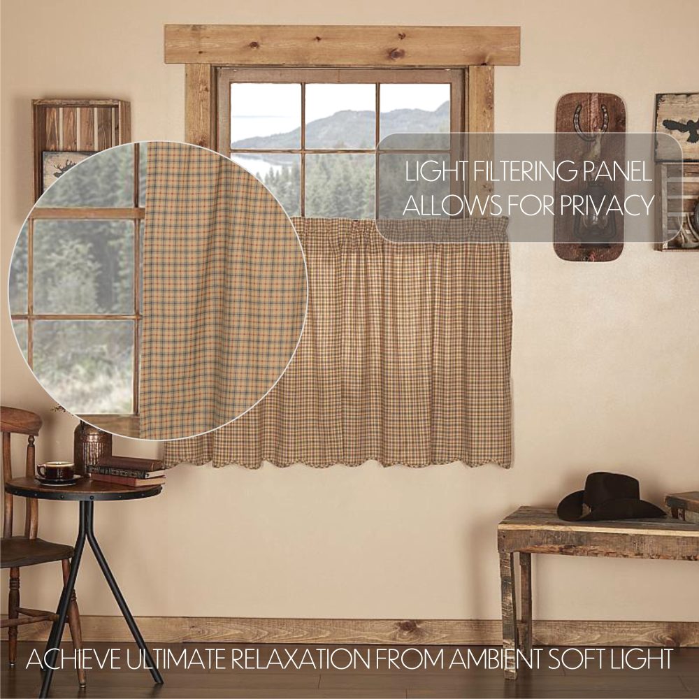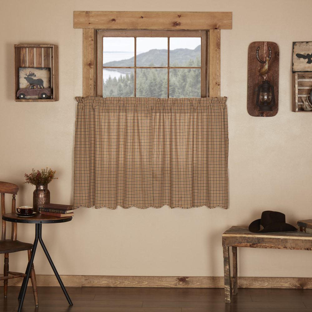 Bring the muted shades of khaki, burgundy and blue to your home with a cozy, sophisticated plaid. The Millsboro Scalloped Tier Set measures 36x36 inches and features a scalloped edge and a rich blend of traditional country colors for a look that is both stylish and comforting. This fully lined, classic country tier set features a rod pocket and loops for easy hanging.