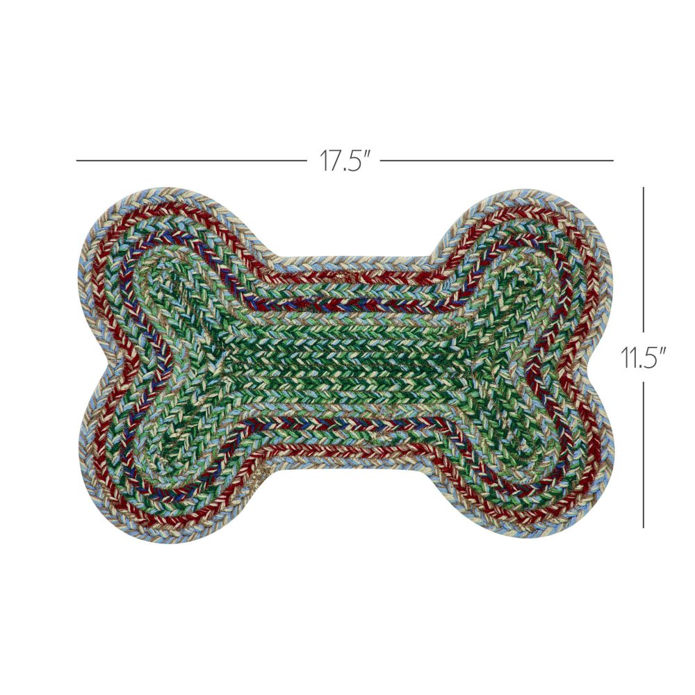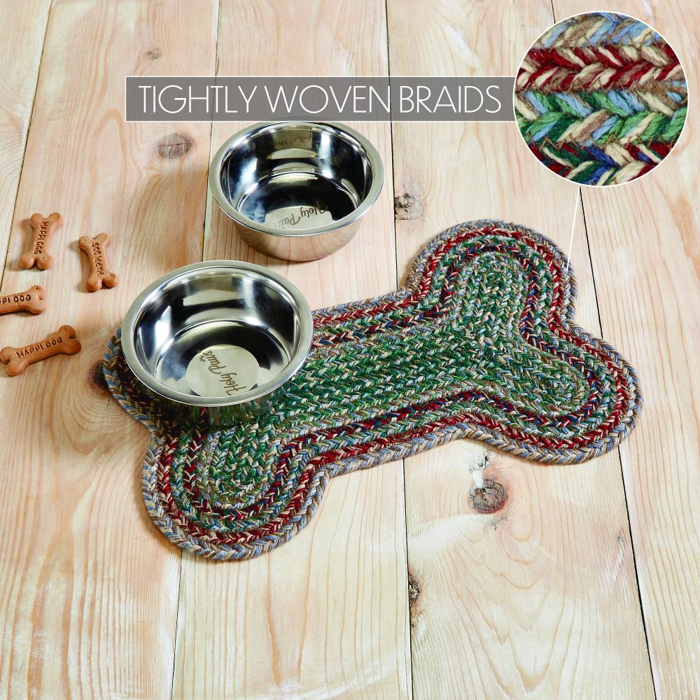 Give your pet a rug that is both stylish and practical. The Multi Braided Small Bone Rug measures 11.5x17.5 inches and is crafted with 100% recycled polyester material (PET) making it waterproof and durable. The bone-shaped pet rug is suitable for both indoor and outdoor use and is the perfect home for water and food bowls for small breed dogs. The mix of blues, greens, red, and tan make this a charming addition to any country boho home.