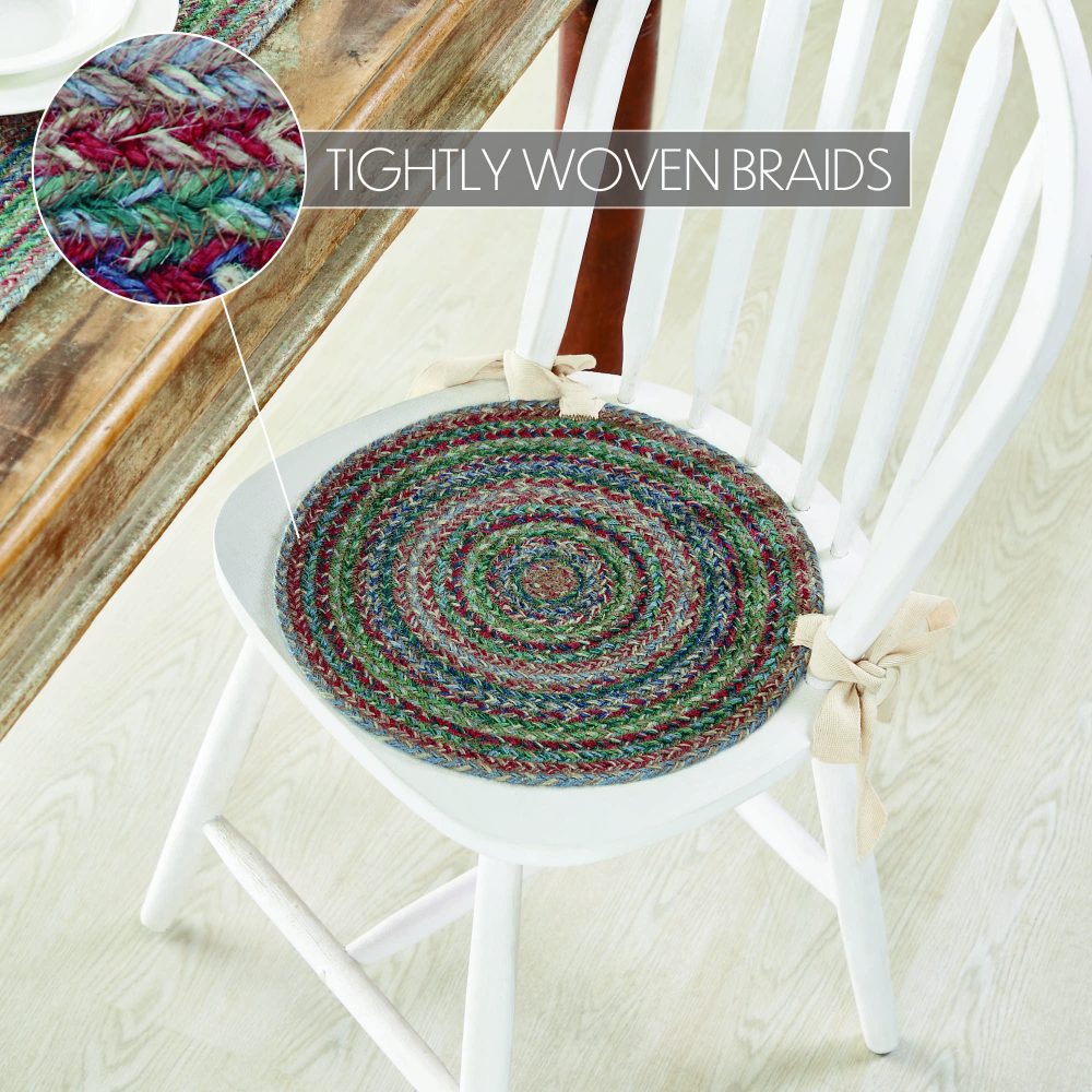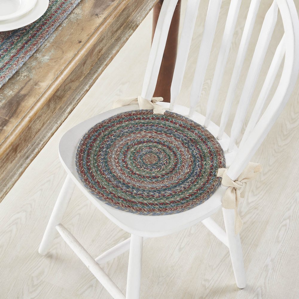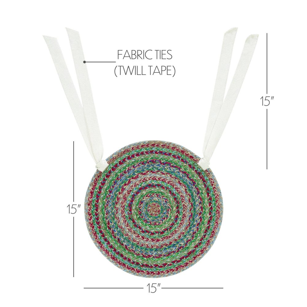 Bring warmth and cheer to your kitchen with braided jute in rich pine greens, soft blues, bright garnet red and beige. The Multi Jute Chair Pad is a durable 15 inch round chair cushion with long ties to easily add a pop of country boho style to a wide variety of seating. This round seat pad features an 80 percent jute blend that lays flat easily for natural texture and style while offering your chair protection from damage. Spot clean as needed. To give your kitchen or tabletop a complete look, pair with other items from the Multi Jute Collection including modern farmhouse placemats, table runners and more for a deeply inviting, feels-like-home dining space.