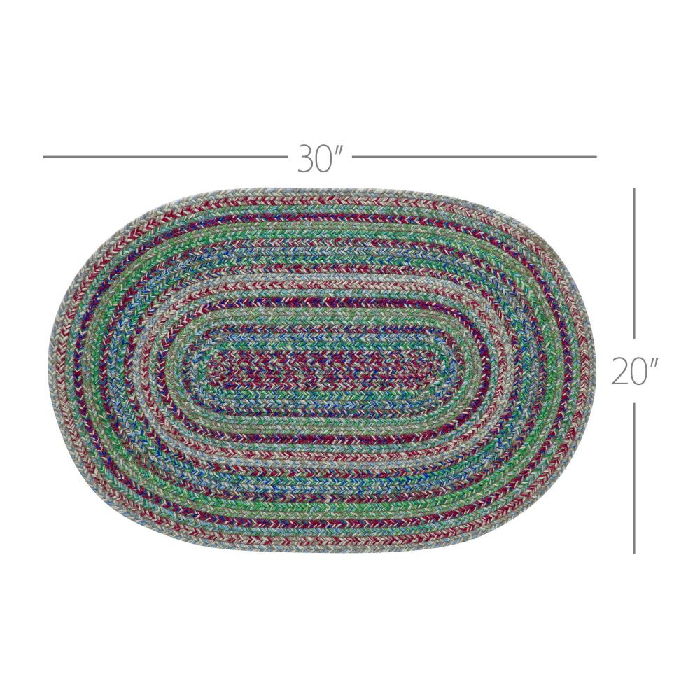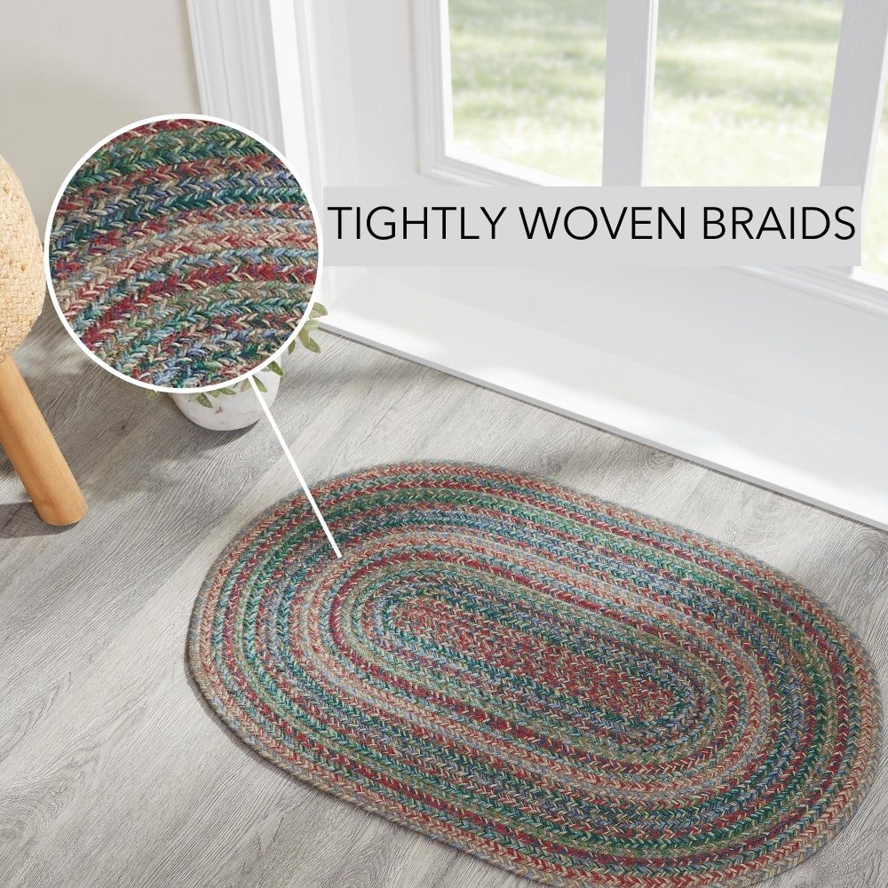 Create a bright, colorful look for your entryway with bold shades of blue, green, and red in a curl-resistant jute blend that adds style and safety. The Multi Jute Rug measures 20x30 inches and features a classic oval shape and tight braids constructed with a durable jute blend. The special blend relaxes faster and stays flat. Features a blend of bold blue tones, forest greens, garnet red and natural tan for a joyful, country boho look that complements a wide array of modern and rustic farmhouse decor.